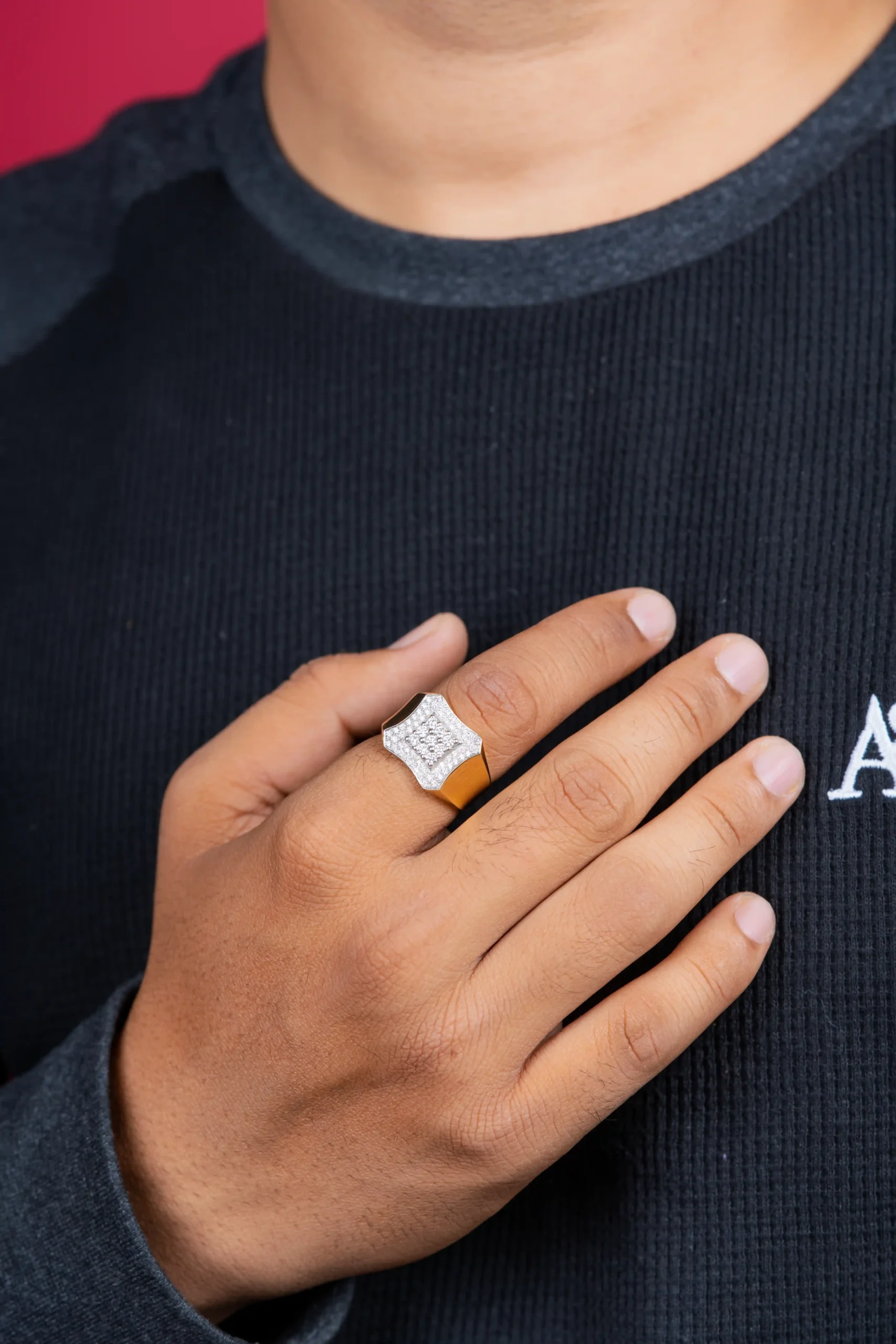 The Aarav Sovereign Diamond Ring is a powerful expression of authority, confidence, and refined masculinity. Designed with a bold shield-shaped top adorned with sparkling diamond-look stones, this ring reflects strength and leadership. Its solid band and structured form offer a commanding presence, making it a statement piece for men who carry themselves with purpose.