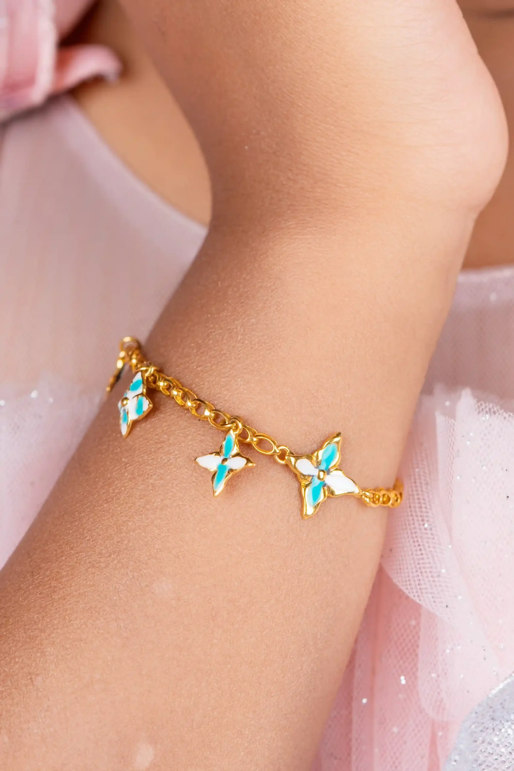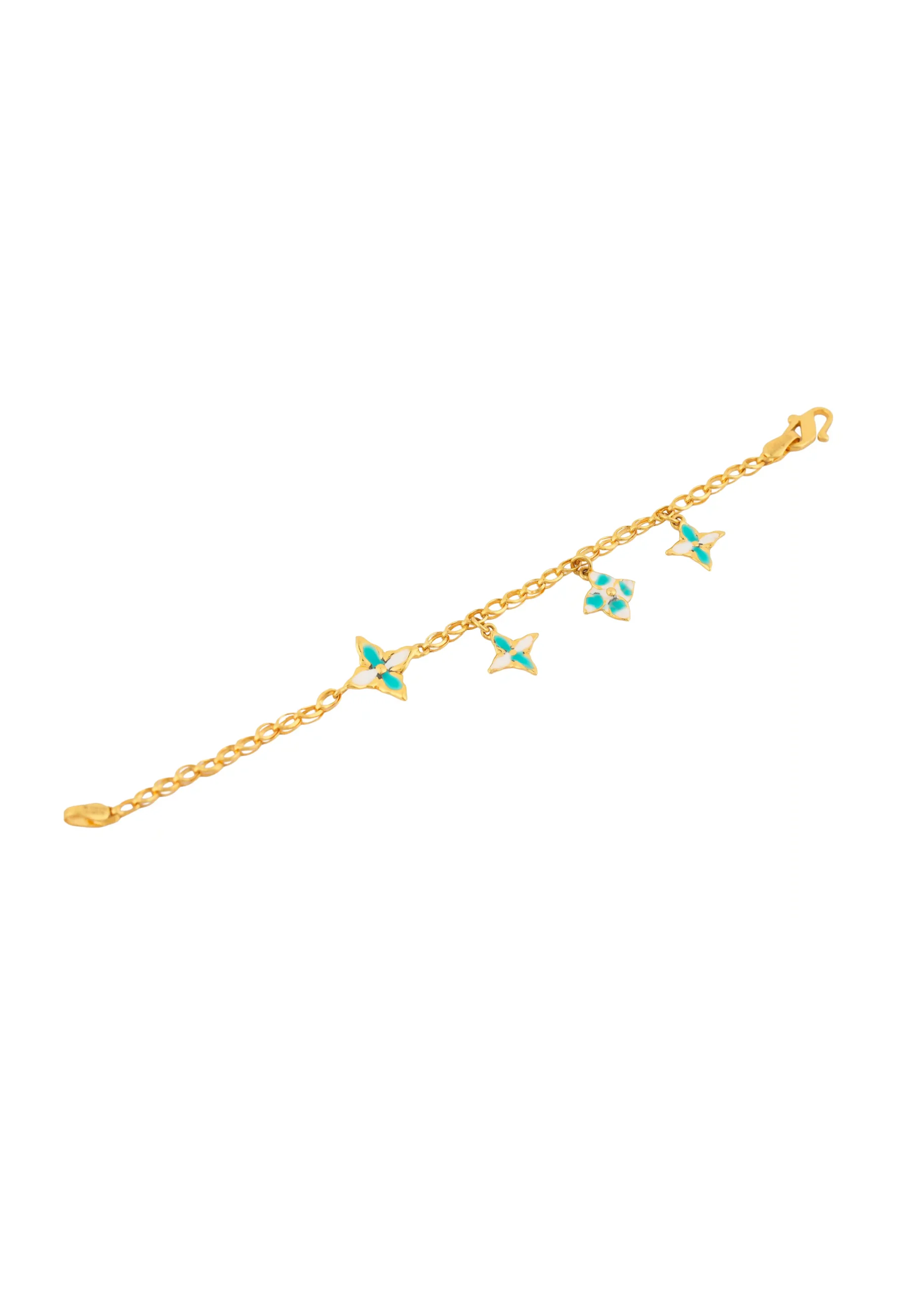 The Blue Wing Elegance Gold Bracelet is a graceful celebration of beauty and freedom, inspired by the delicate charm of butterflies. Crafted in radiant gold, this bracelet features finely detailed butterfly motifs highlighted with soothing blue enamel accents, creating a light and elegant visual appeal.