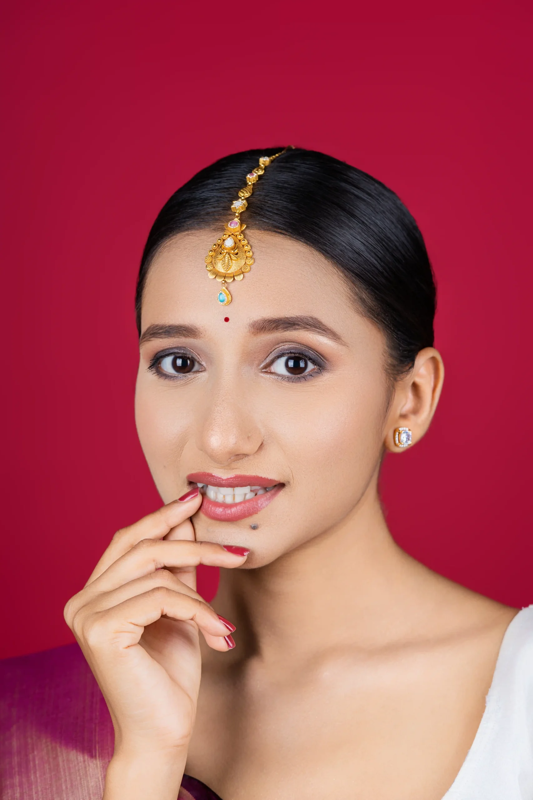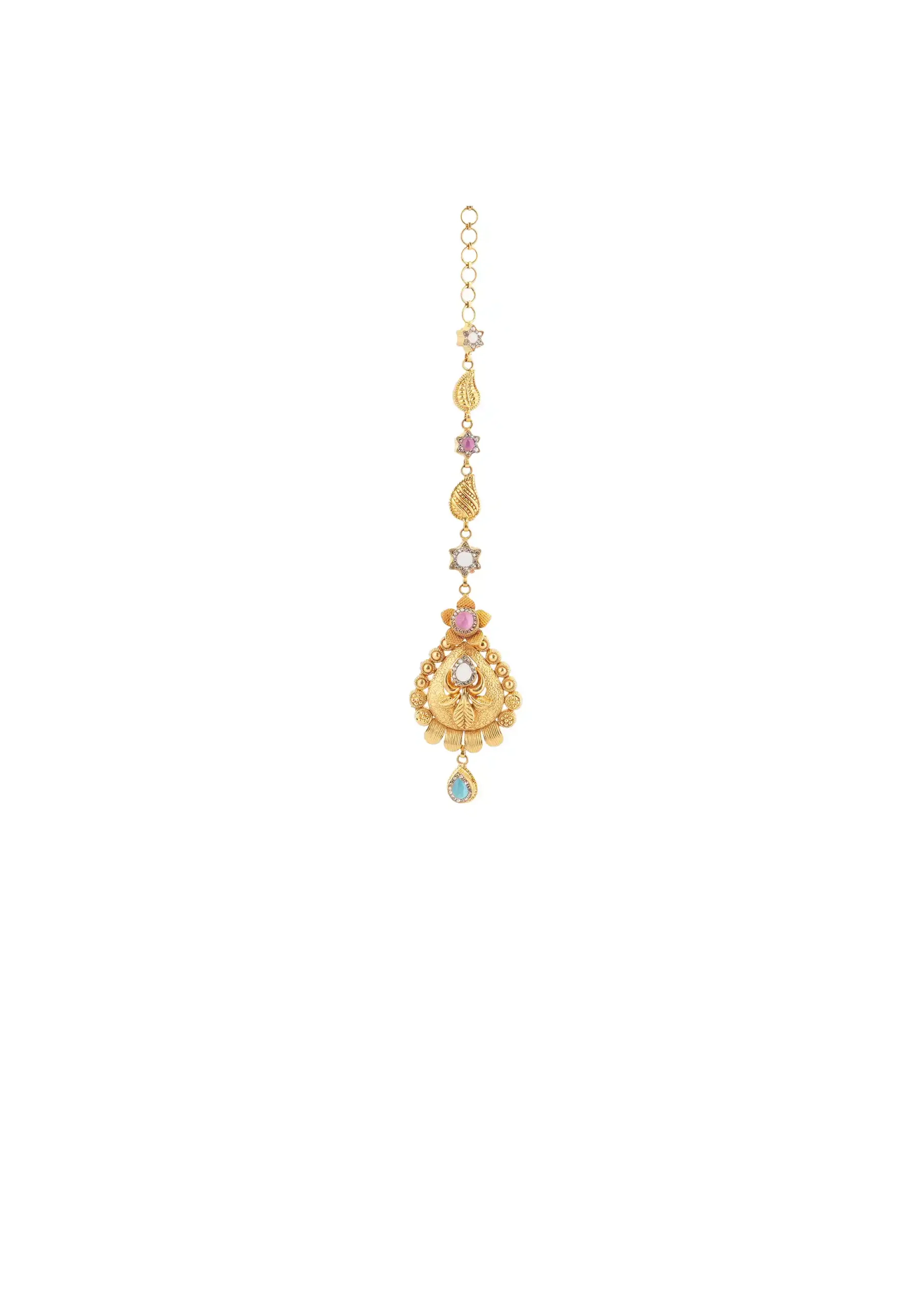 Complete your bridal look with this graceful Classic Bridal Maang Tikka, designed to highlight traditional beauty and elegance. Featuring a finely crafted gold-toned design with delicate detailing, this maang tikka rests perfectly along the hair parting, adding a regal and timeless charm to your appearance.