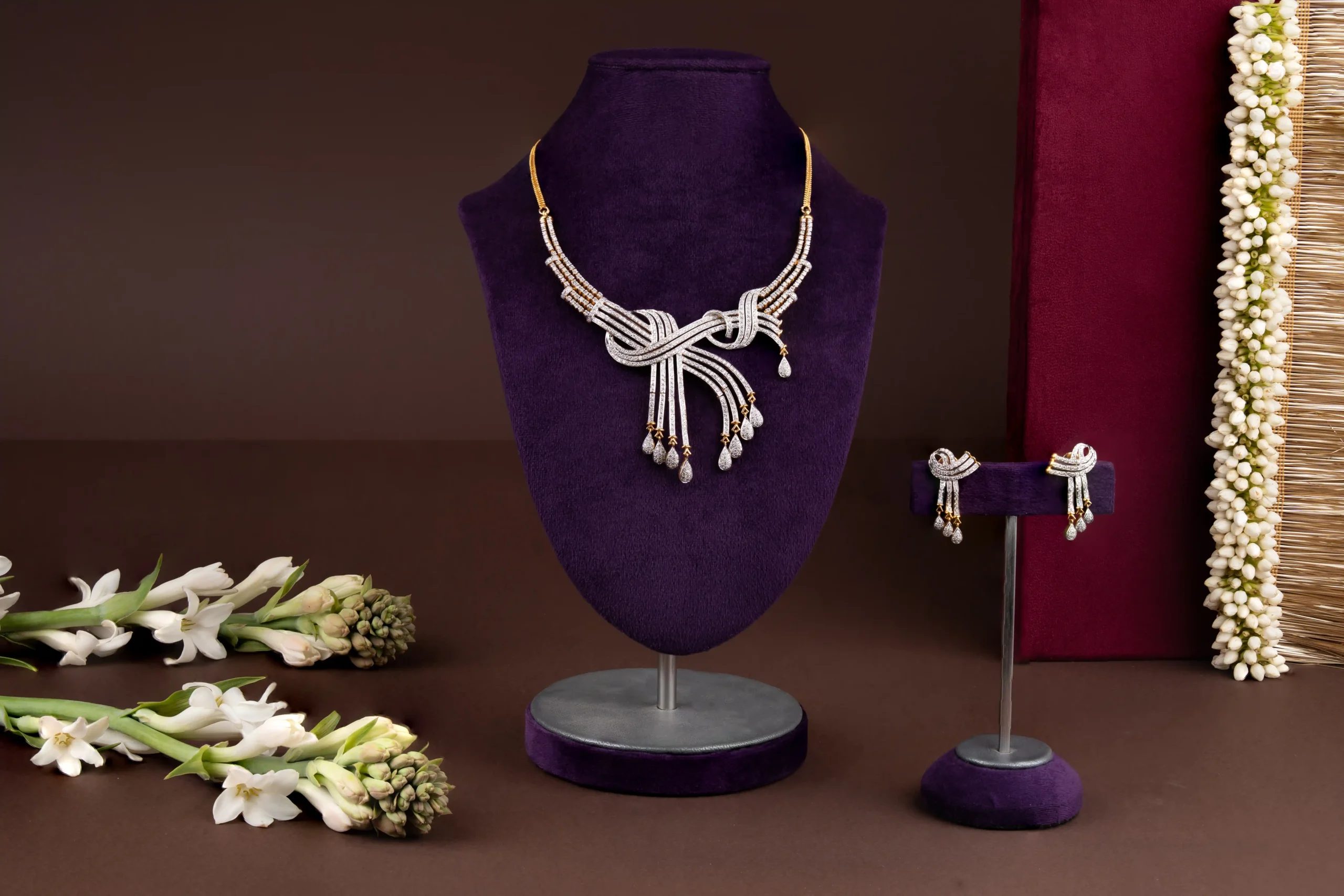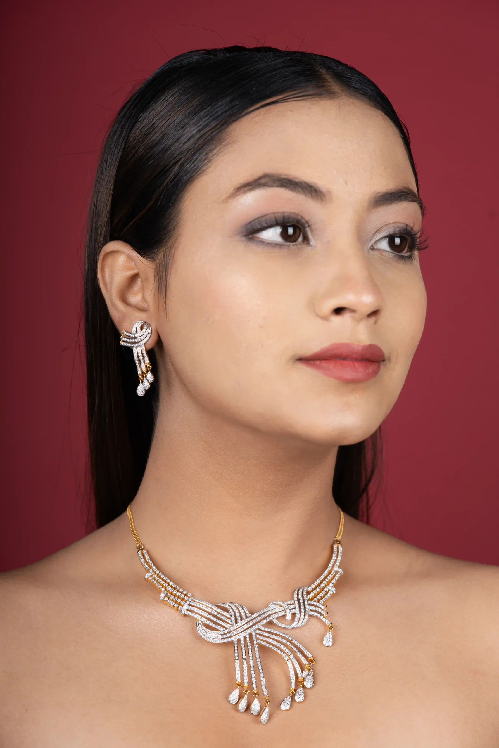 The Elina Infinity Diamond Set is a stunning expression of modern elegance and timeless design. Featuring a graceful infinity-knot inspired centerpiece adorned with sparkling diamond-look stones, this set symbolizes everlasting beauty and sophistication. The flowing drop elements and finely crafted matching earrings add movement and brilliance, creating a refined yet striking look.