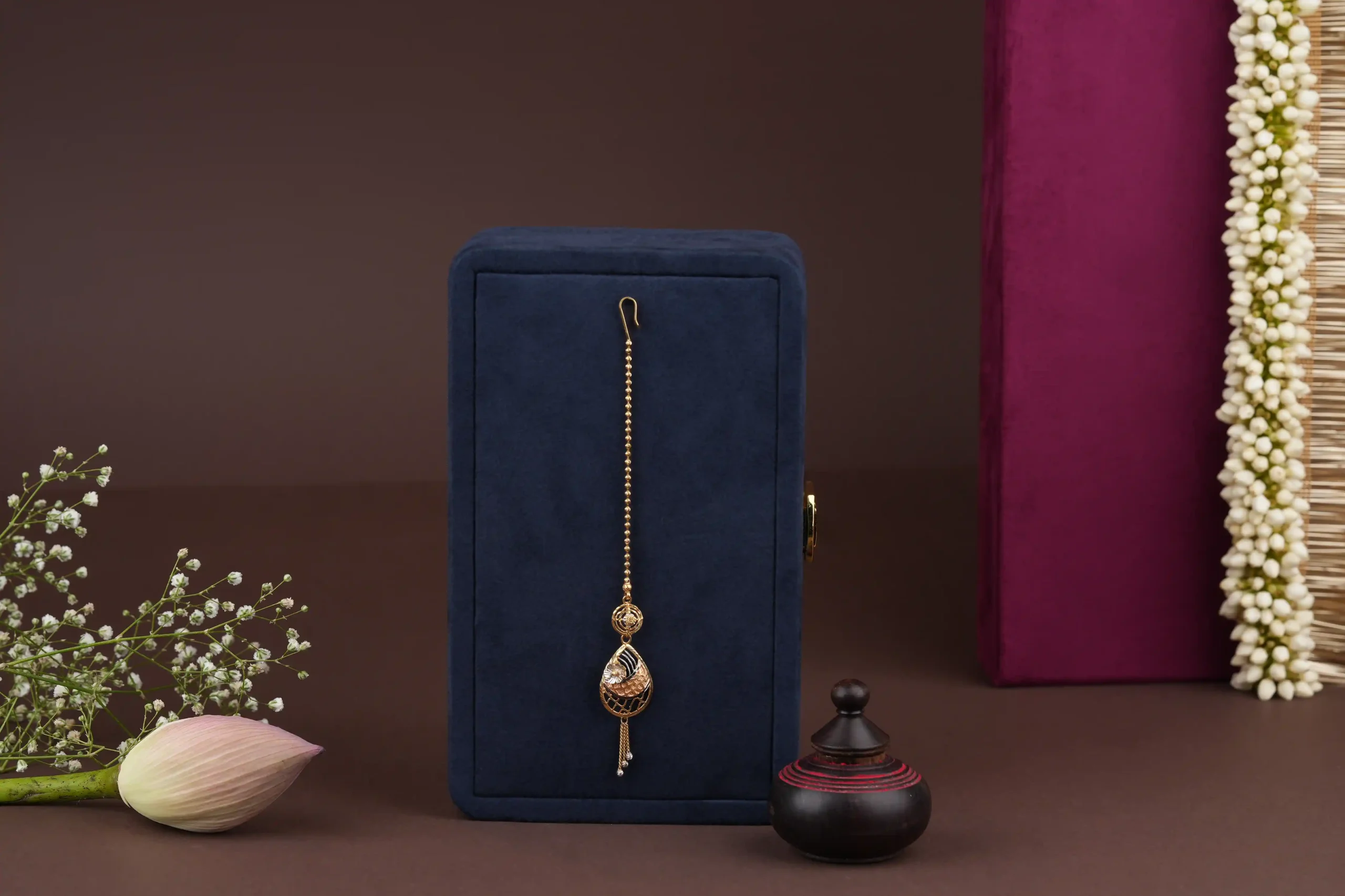 Enhance your traditional look with this beautiful Ethnic Gold Forehead Jewelry, designed to reflect timeless cultural elegance. Crafted with classic detailing and a rich gold-toned finish, this forehead ornament rests gracefully along the hair parting, adding a refined and regal touch to your appearance.