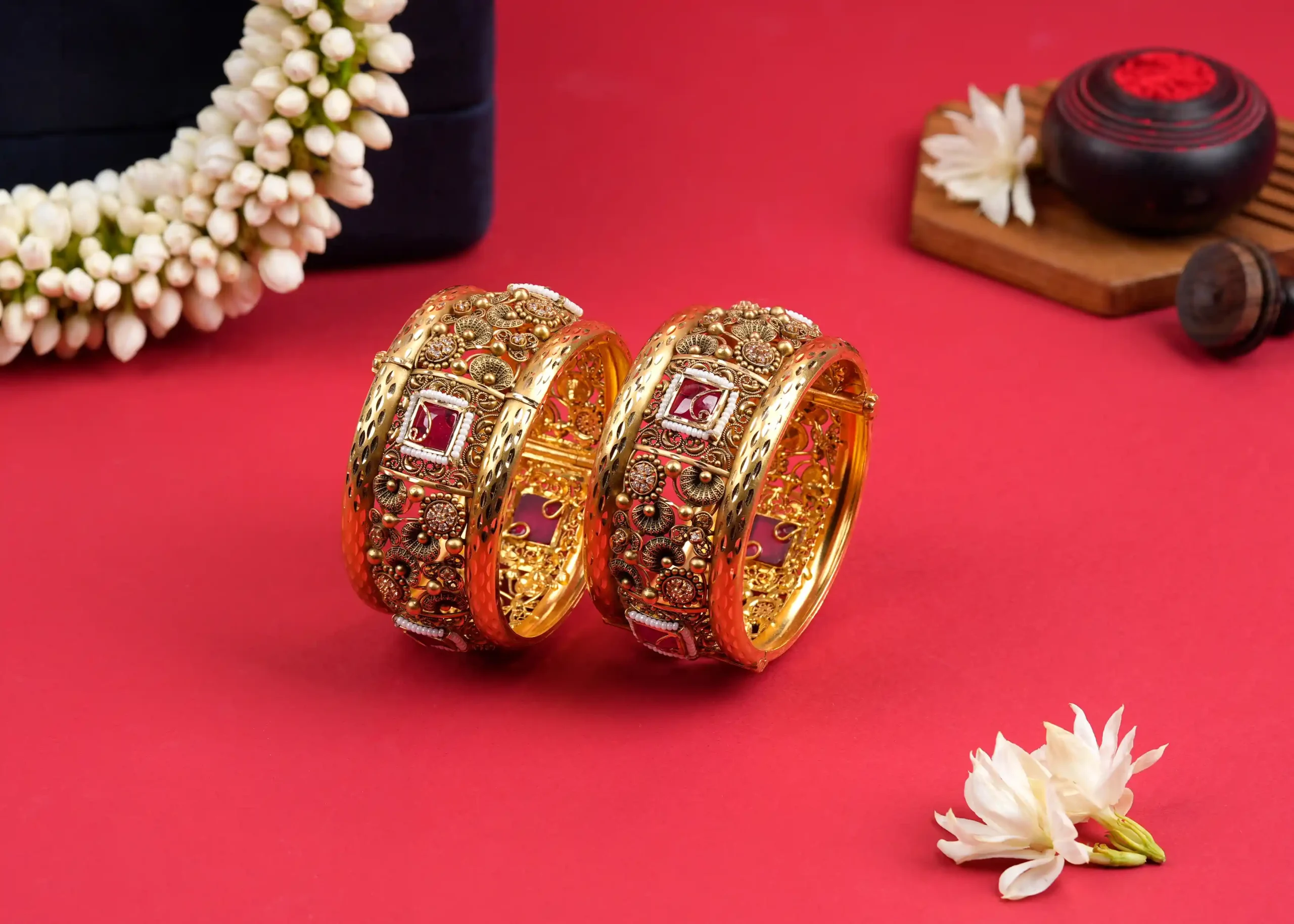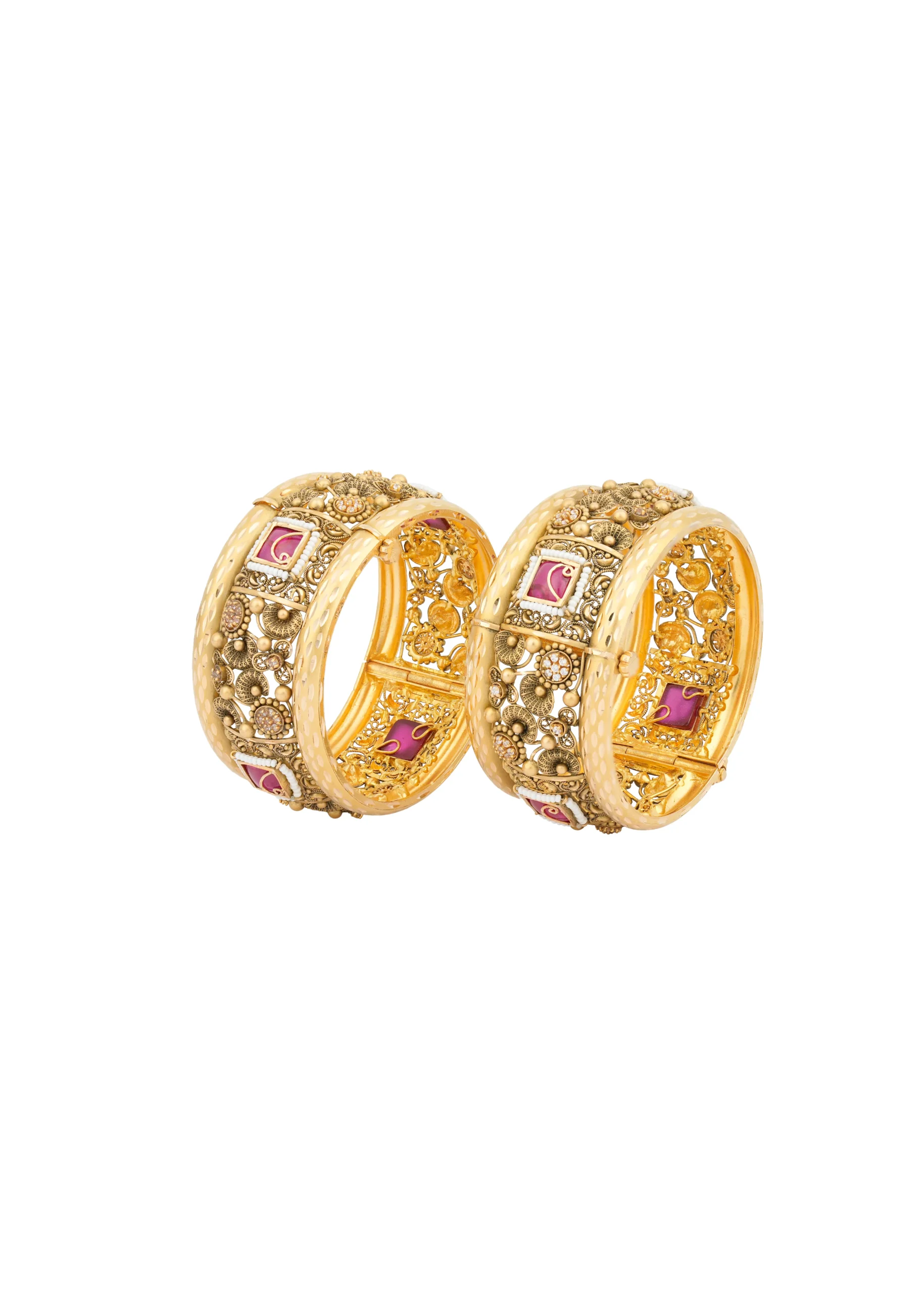 This Ethnic Pink Stone Gold Kangan is a stunning expression of traditional elegance and vibrant charm. Embellished with delicately set pink stones and intricate ethnic detailing, it reflects the richness of Indian craftsmanship. Crafted in high-quality gold, the kangan offers a radiant finish with a smooth inner surface for comfortable wear. Ideal for weddings, festive occasions, and cultural celebrations, this graceful piece adds a pop of color and a touch of royal sophistication to any traditional ensemble.