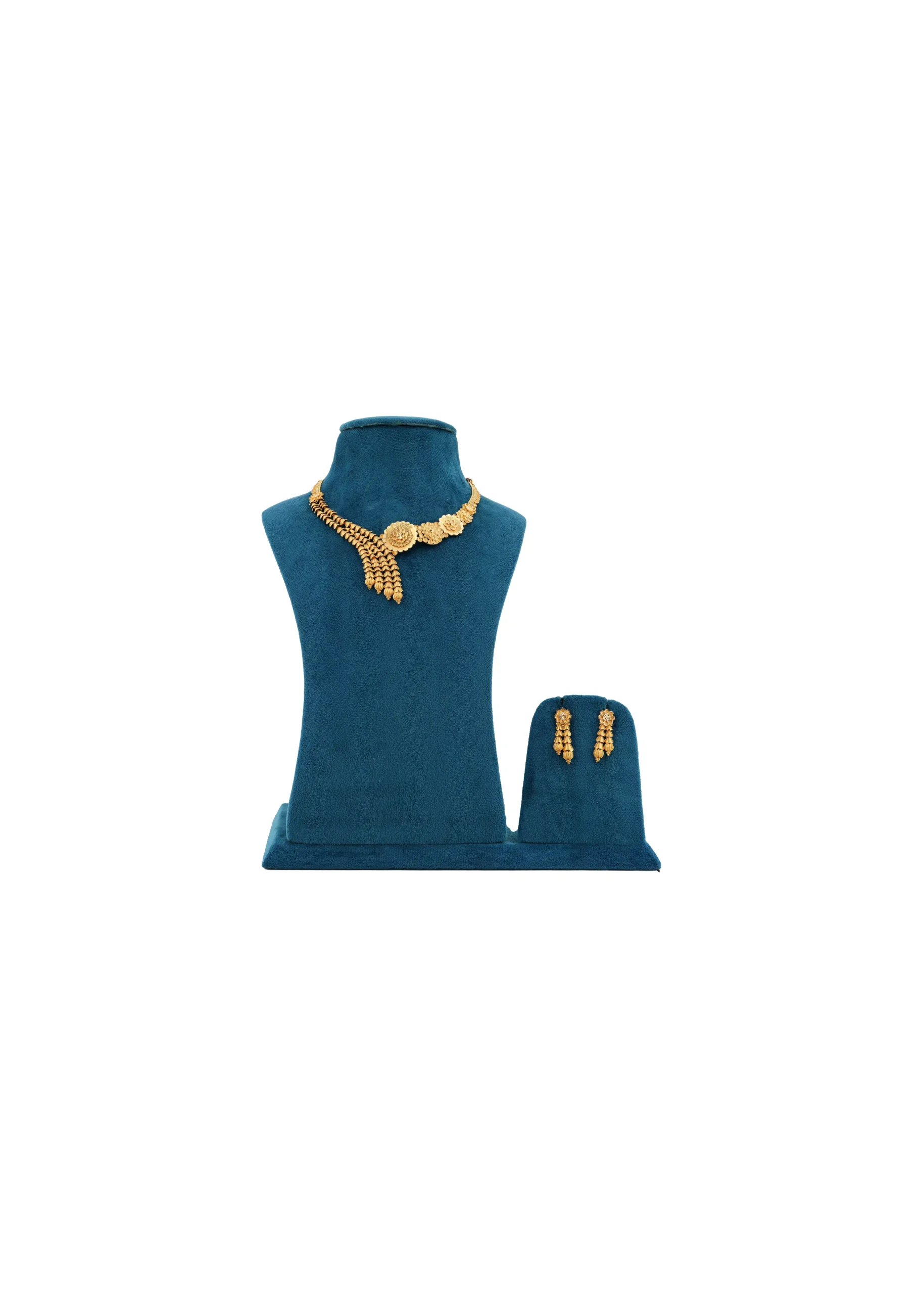 The Floral Luxe Harmony Set features a beautifully crafted gold-tone necklace with a graceful side floral design, paired with matching drop earrings. Blending modern elegance with timeless charm, this set adds a luxurious touch to any special occasion look.