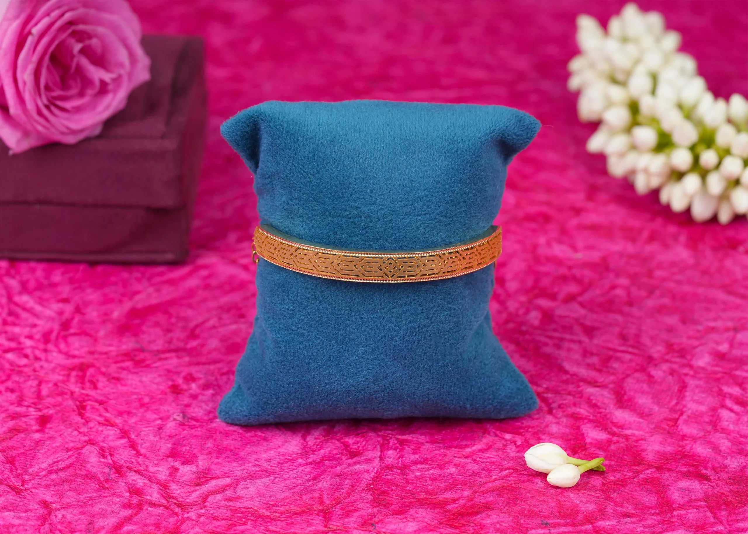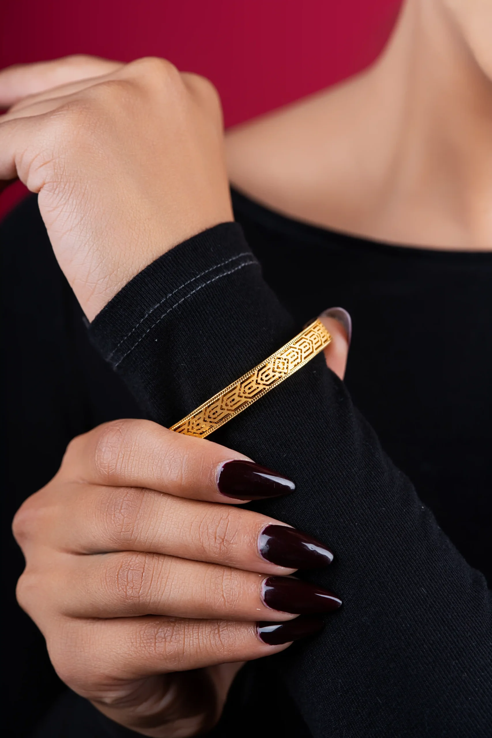 This Geometric Engraved Gold Kada showcases a refined blend of modern symmetry and traditional craftsmanship. Crafted in high-quality gold, it features precise geometric engravings that create a clean, structured, and elegant appearance. The smooth inner finish ensures comfortable wear, making it suitable for daily use as well as festive occasions. A timeless and versatile piece, this kada adds a subtle statement of sophistication and classic charm to both traditional and contemporary outfits.