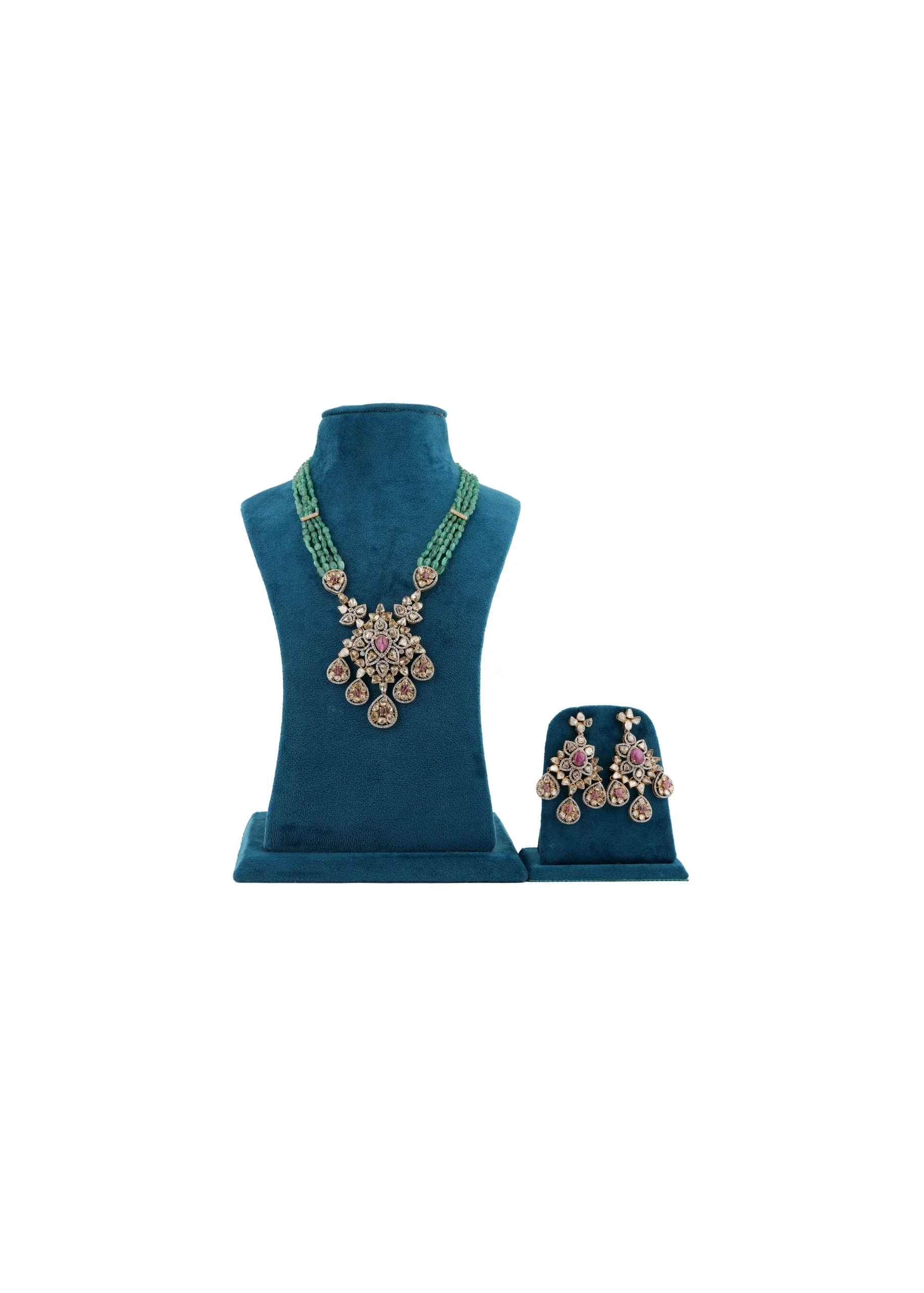 Step into royal elegance with the Gold Real Shahi Emerald Polki Set, a majestic creation inspired by the grandeur of Indian heritage jewelry. Expertly handcrafted in luxurious gold tones, this exquisite set features authentic Polki diamonds paired with rich strands of natural emerald beads, reflecting timeless sophistication and regal charm.