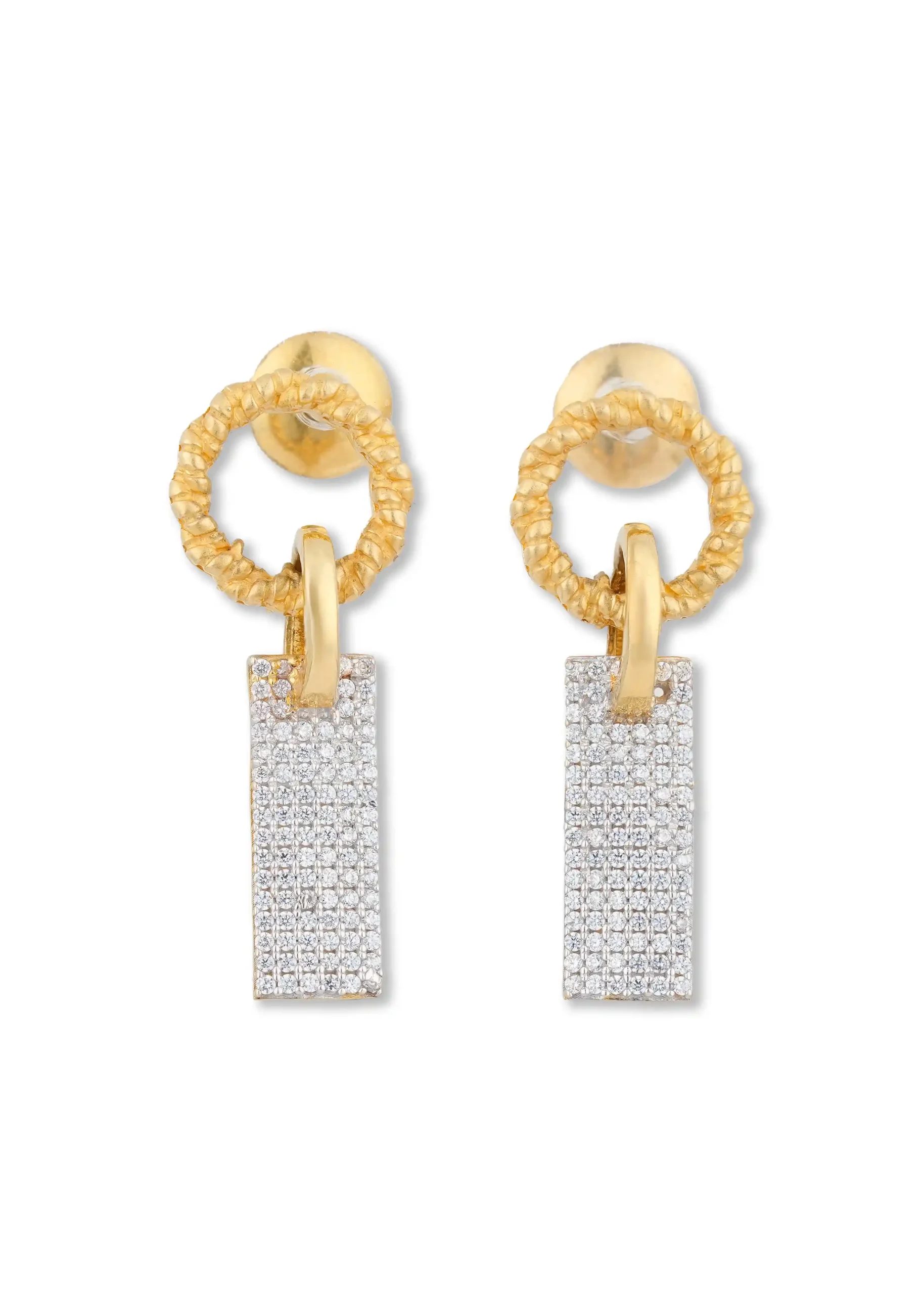 Make a chic style statement with our Gold Ring Bar Earrings. Designed with a radiant gold-tone loop at the top and a sleek rectangular bar drop embellished with sparkling stones, these earrings blend modern elegance with subtle glamour. The unique ring-and-bar combination adds a fashionable edge, making them perfect for both festive and contemporary looks.