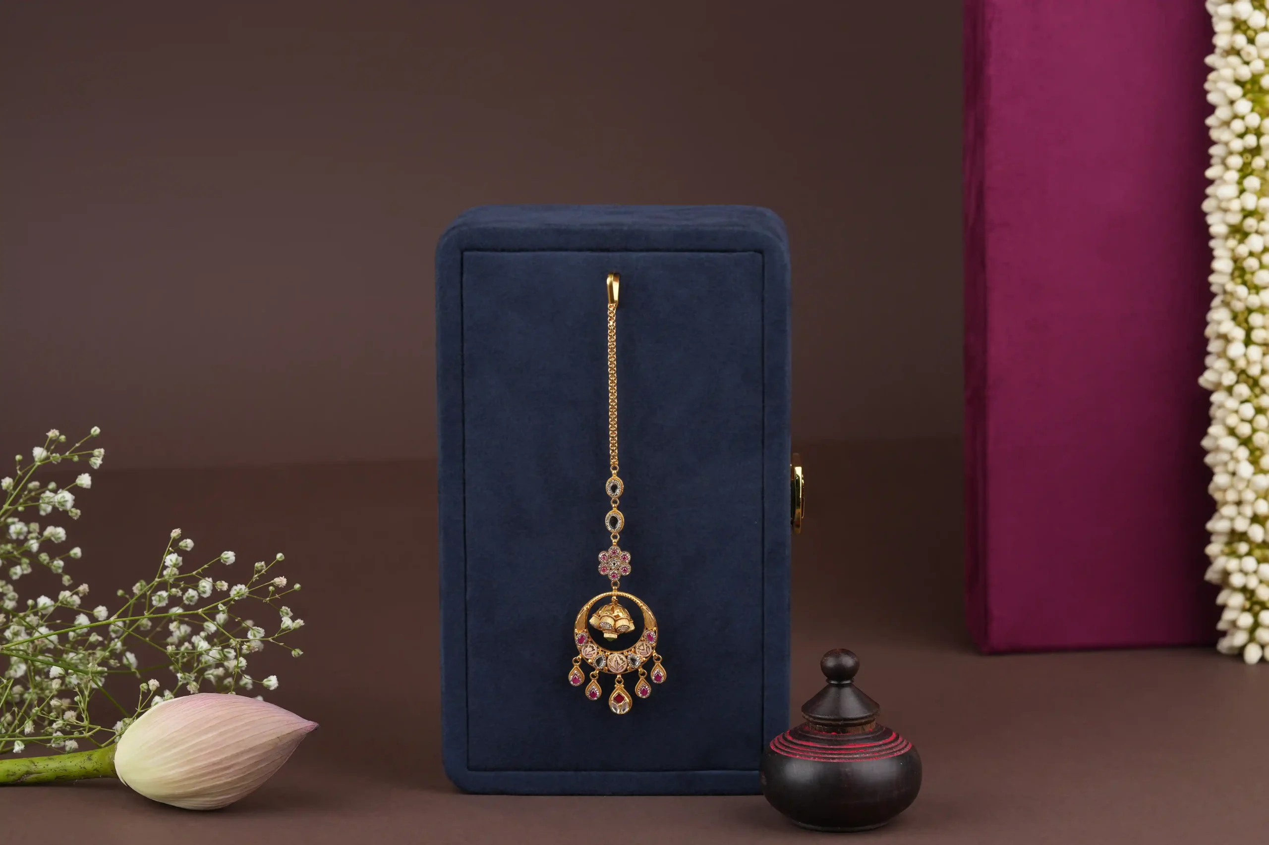 Enhance your traditional look with this graceful Gold-Tone Pearl Forehead Jewelry, designed to add a soft and elegant charm. Featuring delicate pearl drops paired with a classic gold-tone finish, this forehead ornament rests beautifully along the hair parting, creating a refined and feminine appearance.