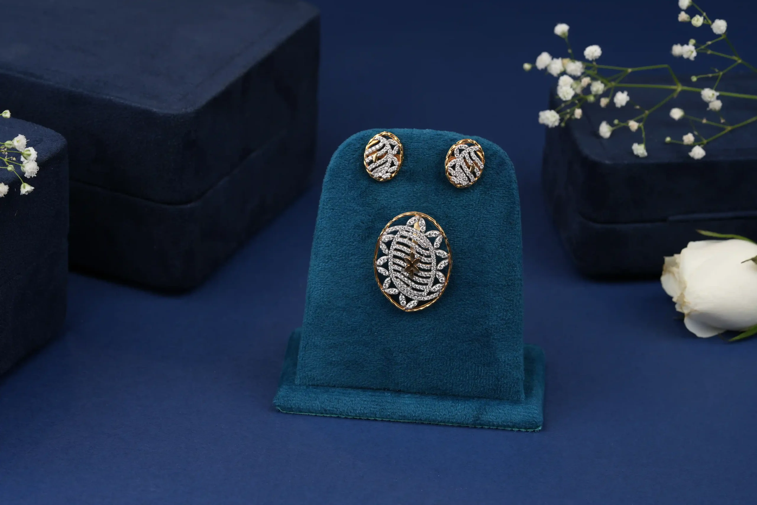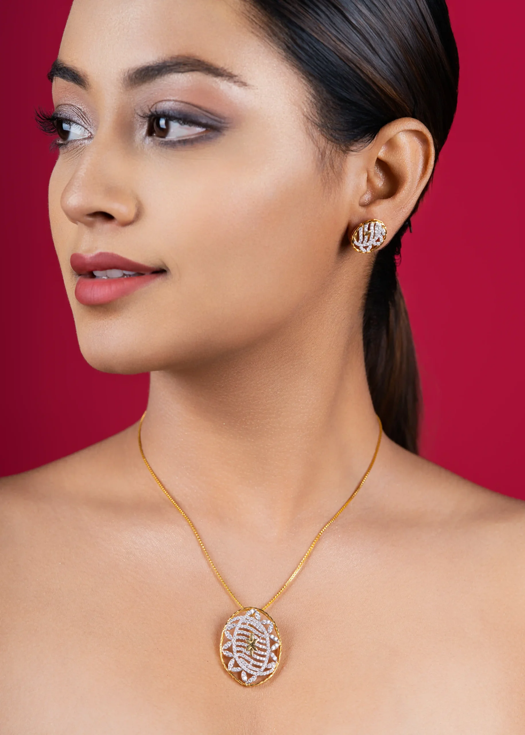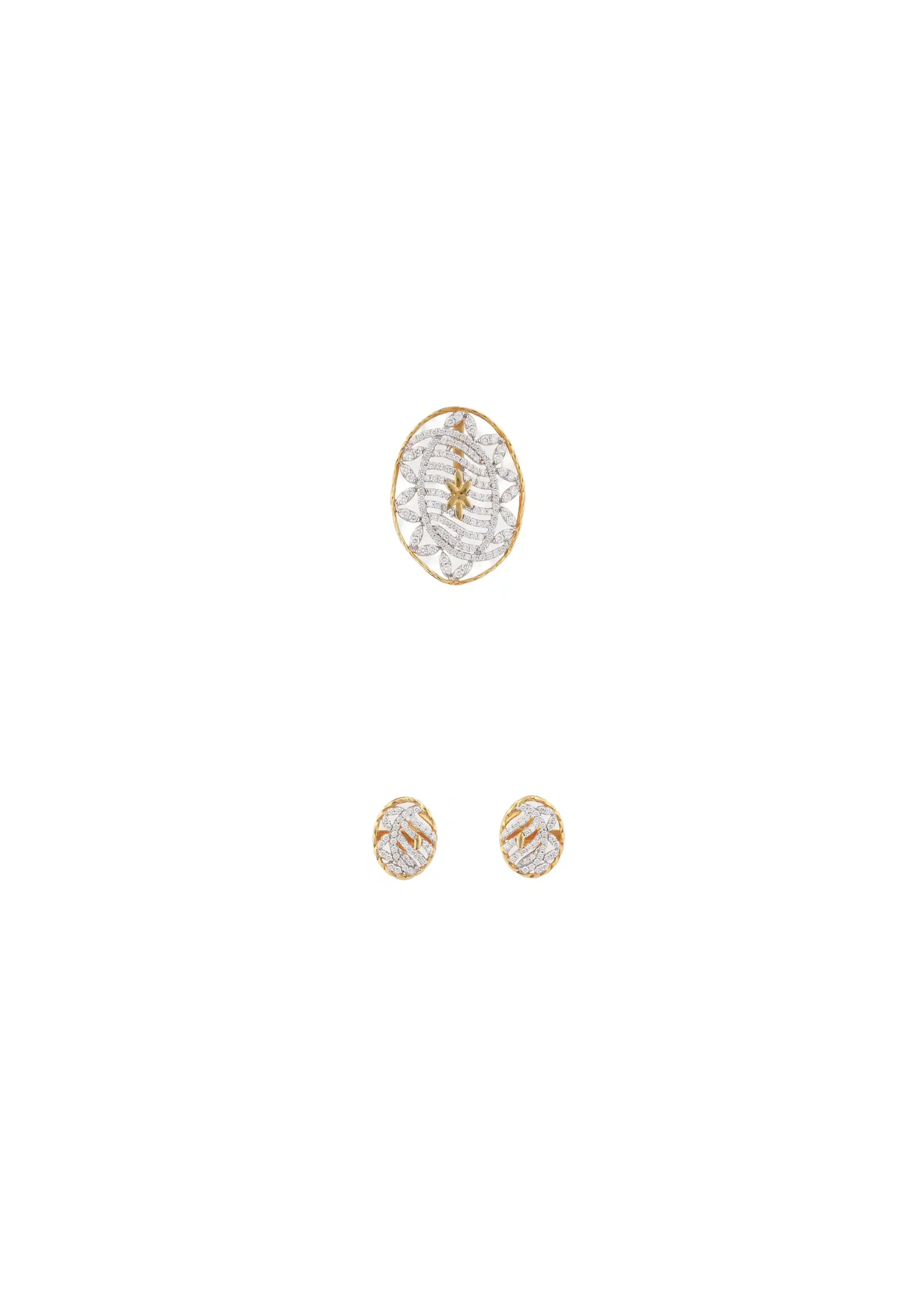 Beautifully crafted in a radiant gold tone, the oval pendant and matching earrings shimmer with delicate crystal accents, making them perfect for both special occasions and everyday sophistication.