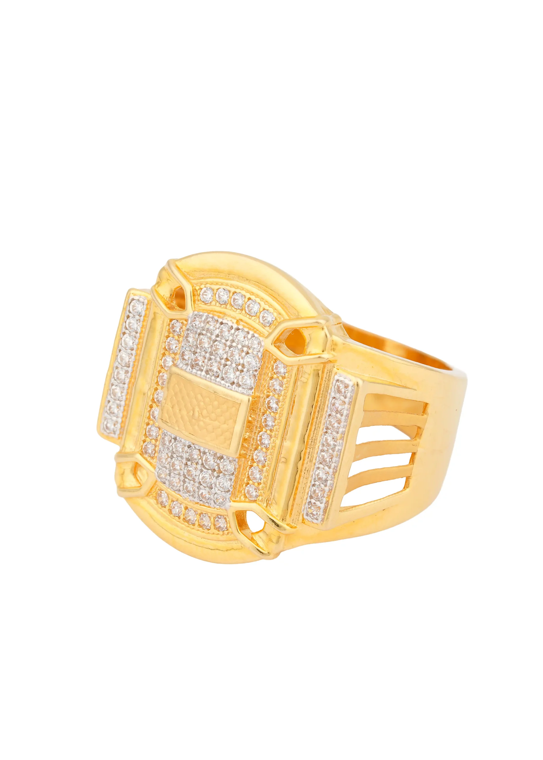 Command attention with the majestic elegance of our Imperial Crown Statement Ring. Designed for those with a taste for luxury, this striking ring features a wide gold-tone band crowned with a richly detailed, stone-studded geometric face. The shimmering CZ stones add a royal brilliance, while the bold structure gives it a powerful, king-like presence.