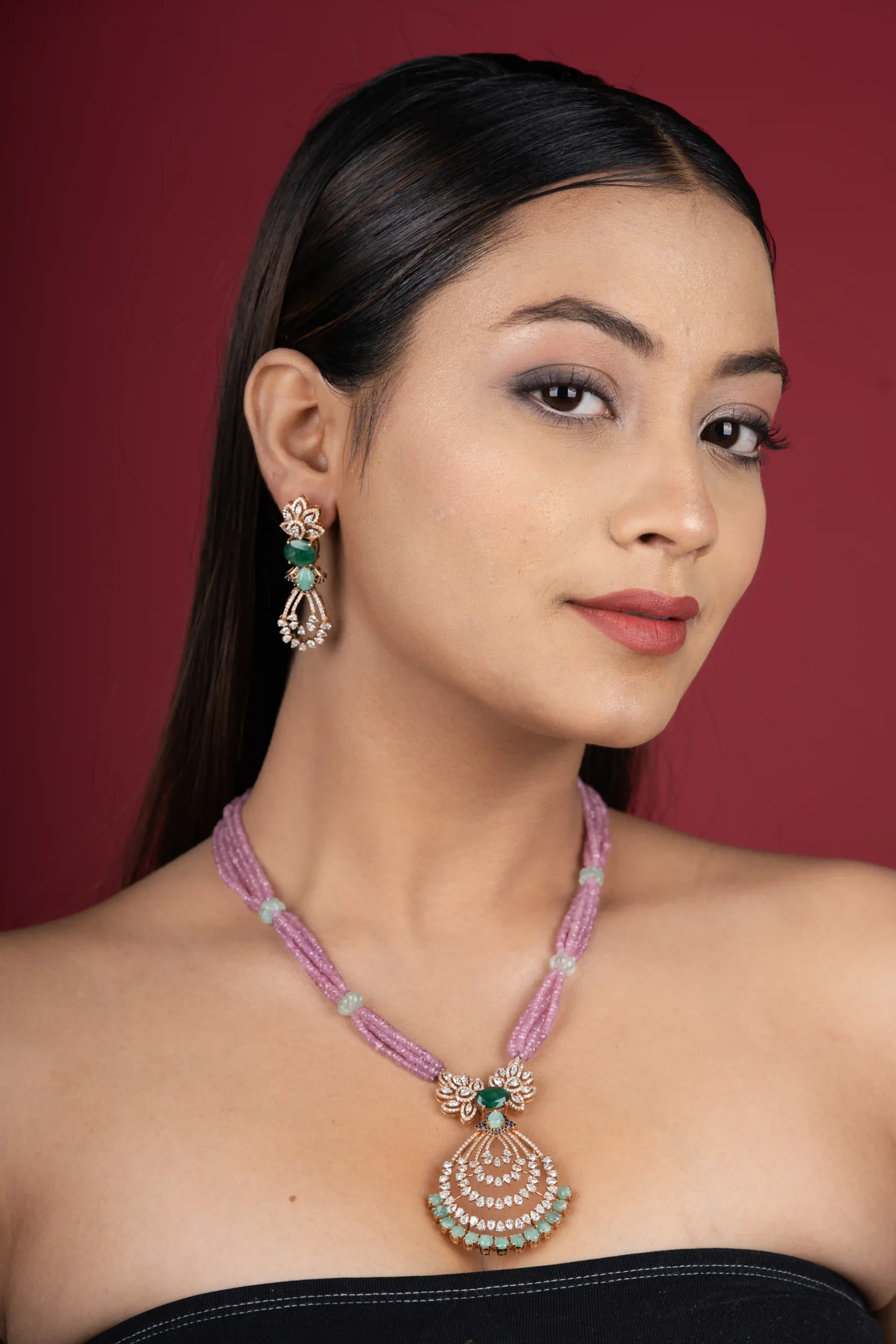 The Ishani Gulbahar Diamond Set is a graceful fusion of floral elegance and timeless sparkle. Designed with delicate diamond-inspired detailing, soft pink bead strands, and rich emerald accents, this set reflects refined craftsmanship and feminine charm. The beautifully layered pendant and matching earrings create a balanced look that is both elegant and eye-catching.