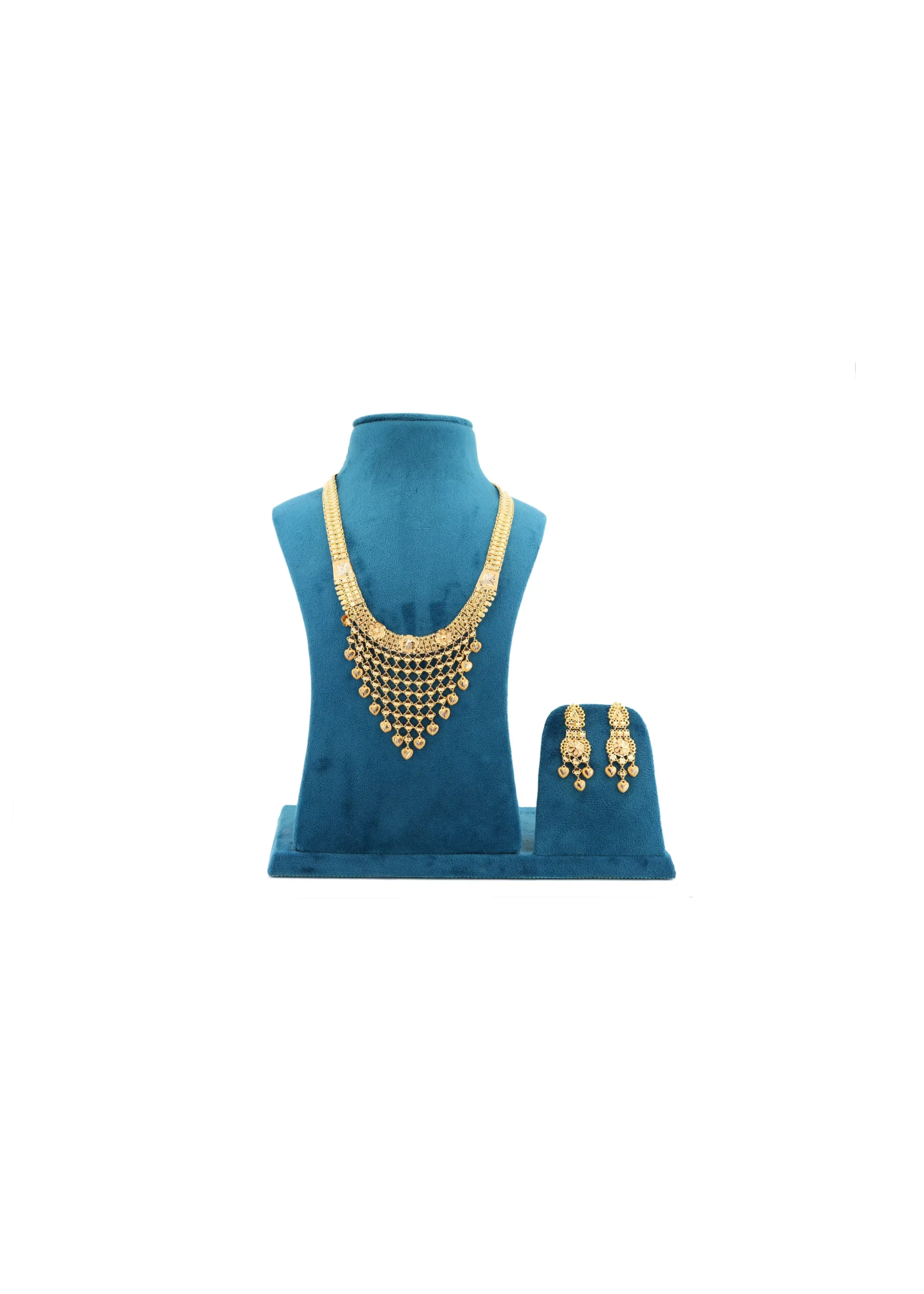 The Majestic Gold Set features a stunning gold-tone necklace with cascading drop detailing, paired with matching statement earrings. Designed to shine with regal elegance, this set is perfect for weddings, festive occasions, and grand celebrations.