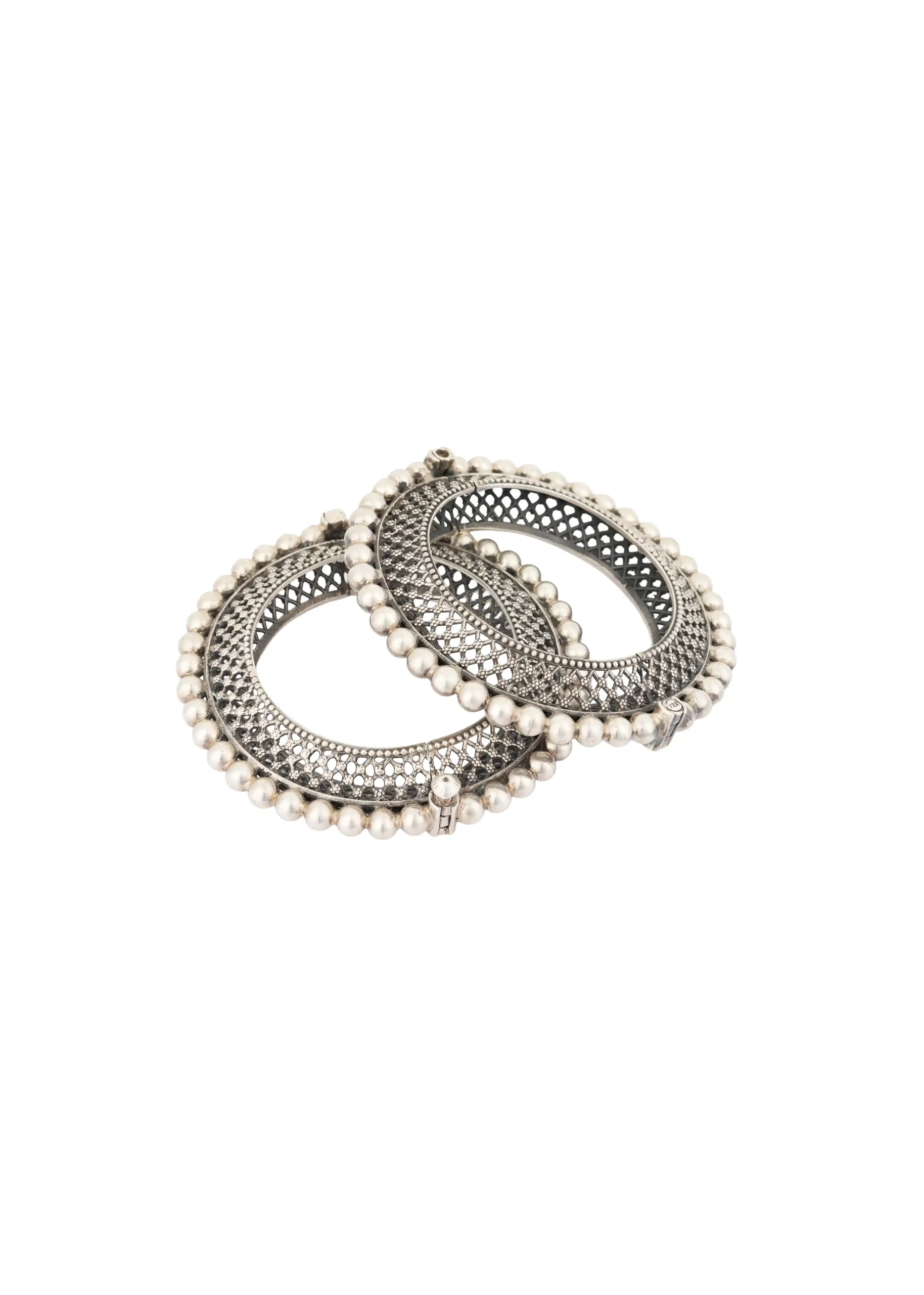 Add timeless ethnic charm to your jewelry collection with these beautifully crafted Oxidized Silver Beaded Bangles. Designed with a classic circular silhouette, these bangles feature an intricate mesh-textured surface highlighted by a delicate beaded (ghungroo-style) border, giving them a rich antique appeal.