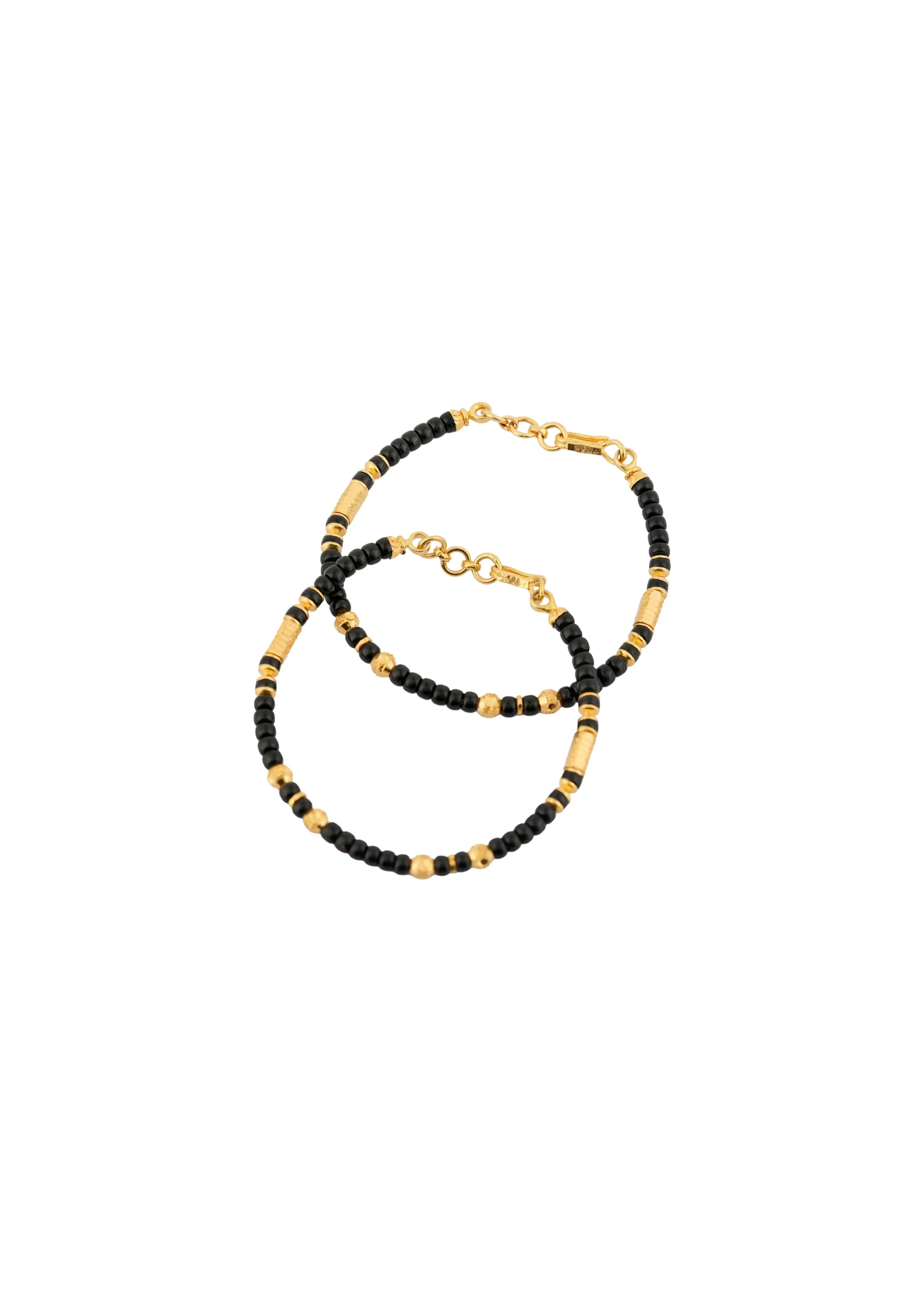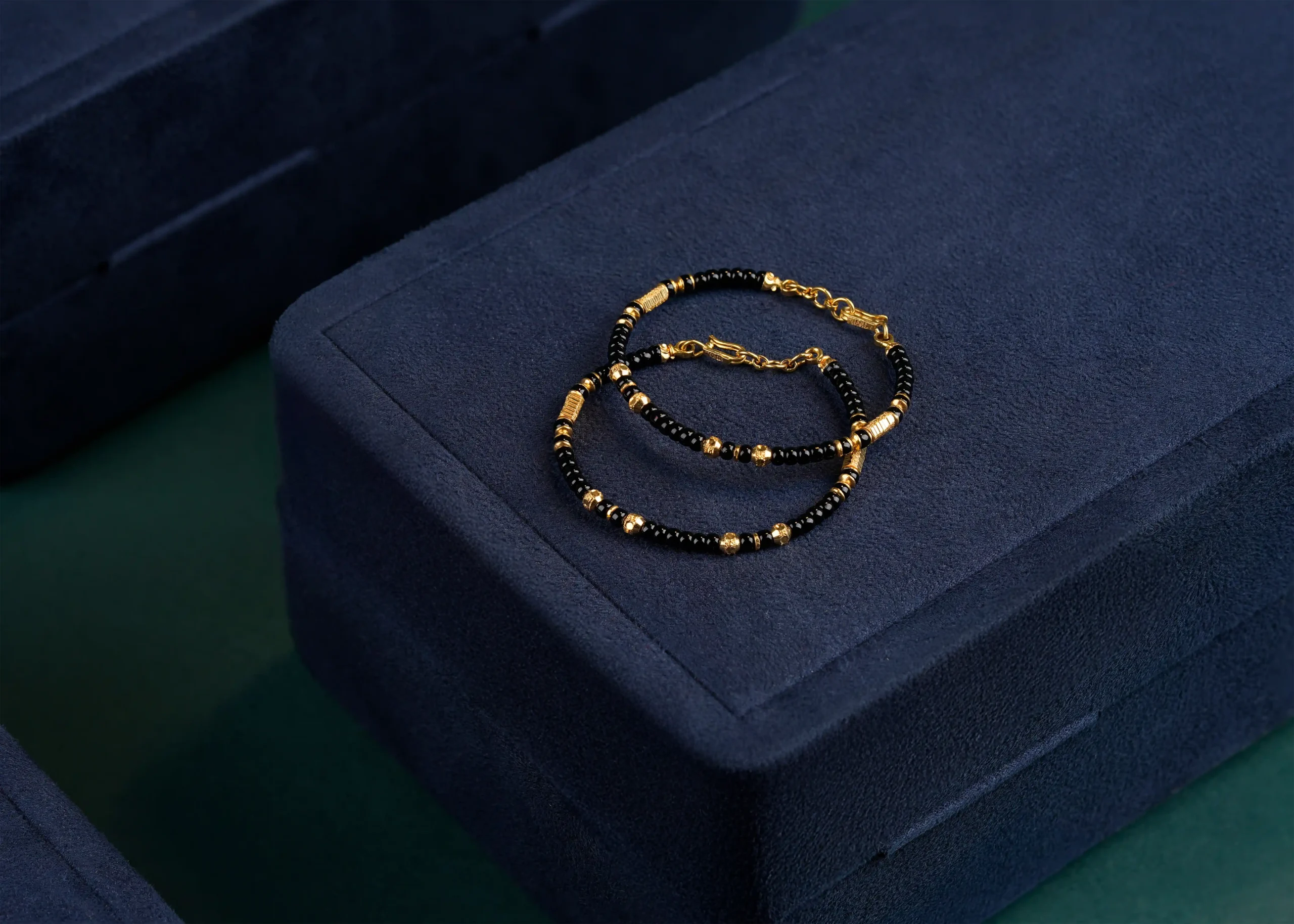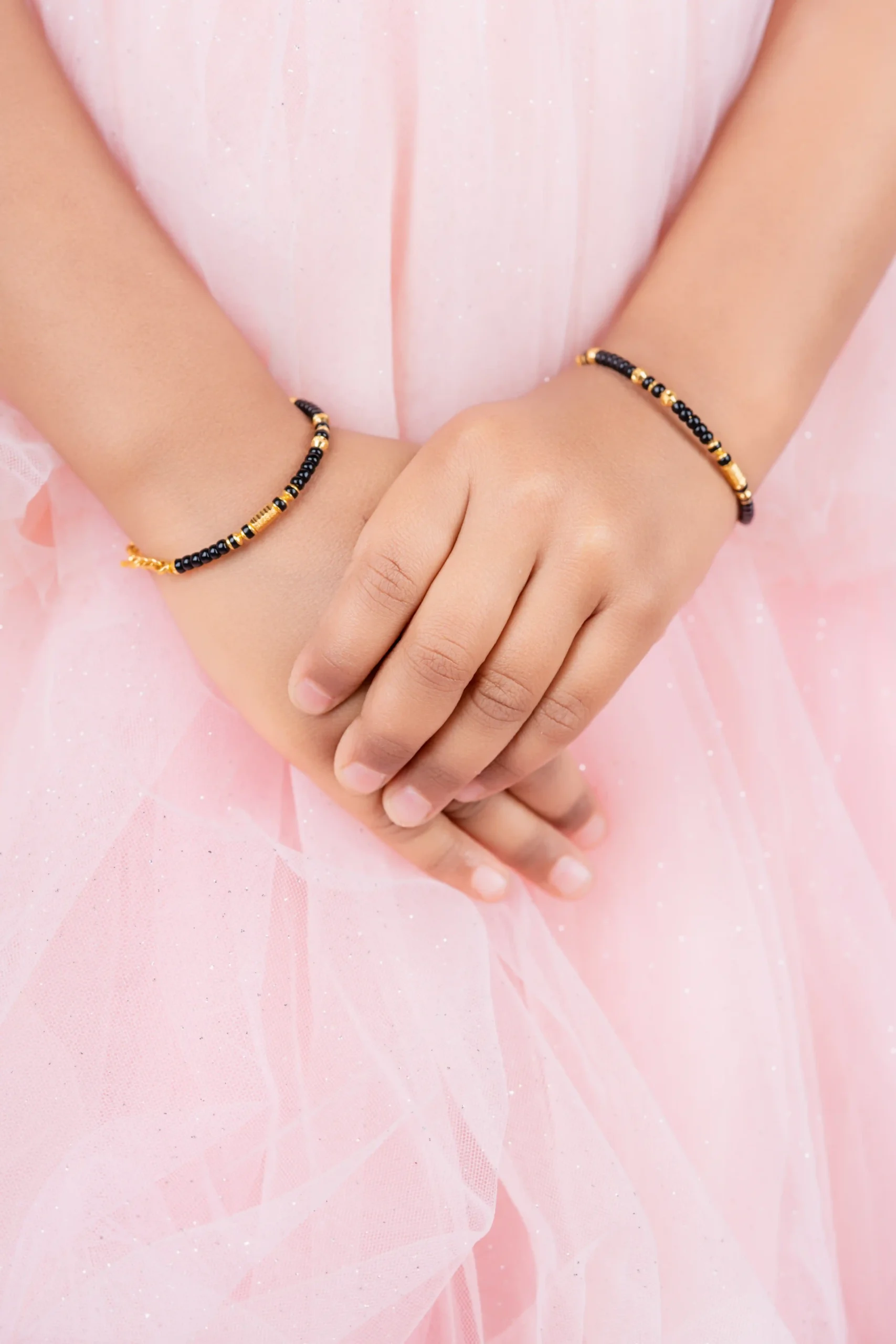 The Pure Love Black Bead Nazariya is a simple yet meaningful bracelet designed to protect little ones with care and affection. Crafted with classic black beads and subtle gold accents, this nazariya carries a traditional belief of guarding against negativity while symbolizing love and warmth.