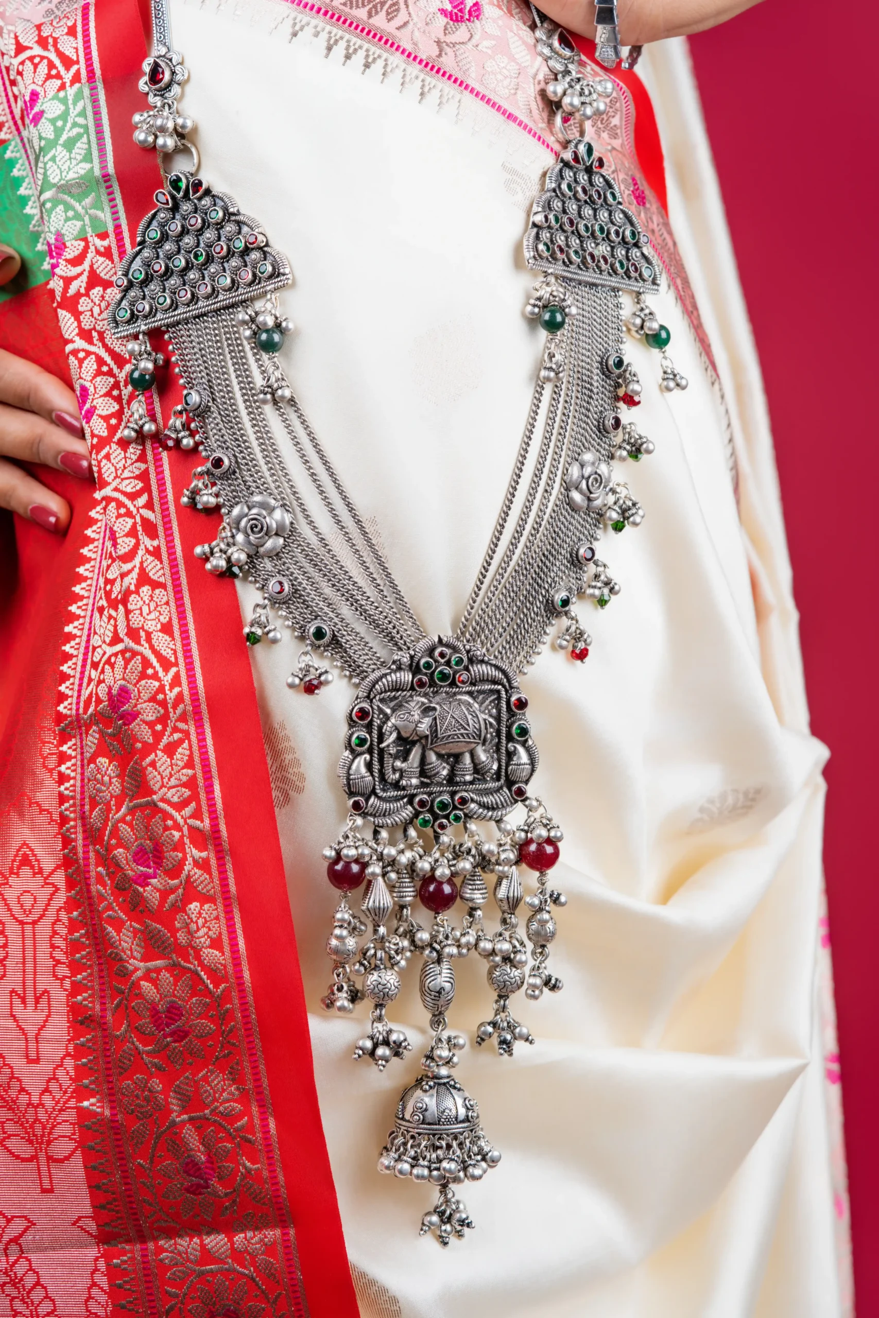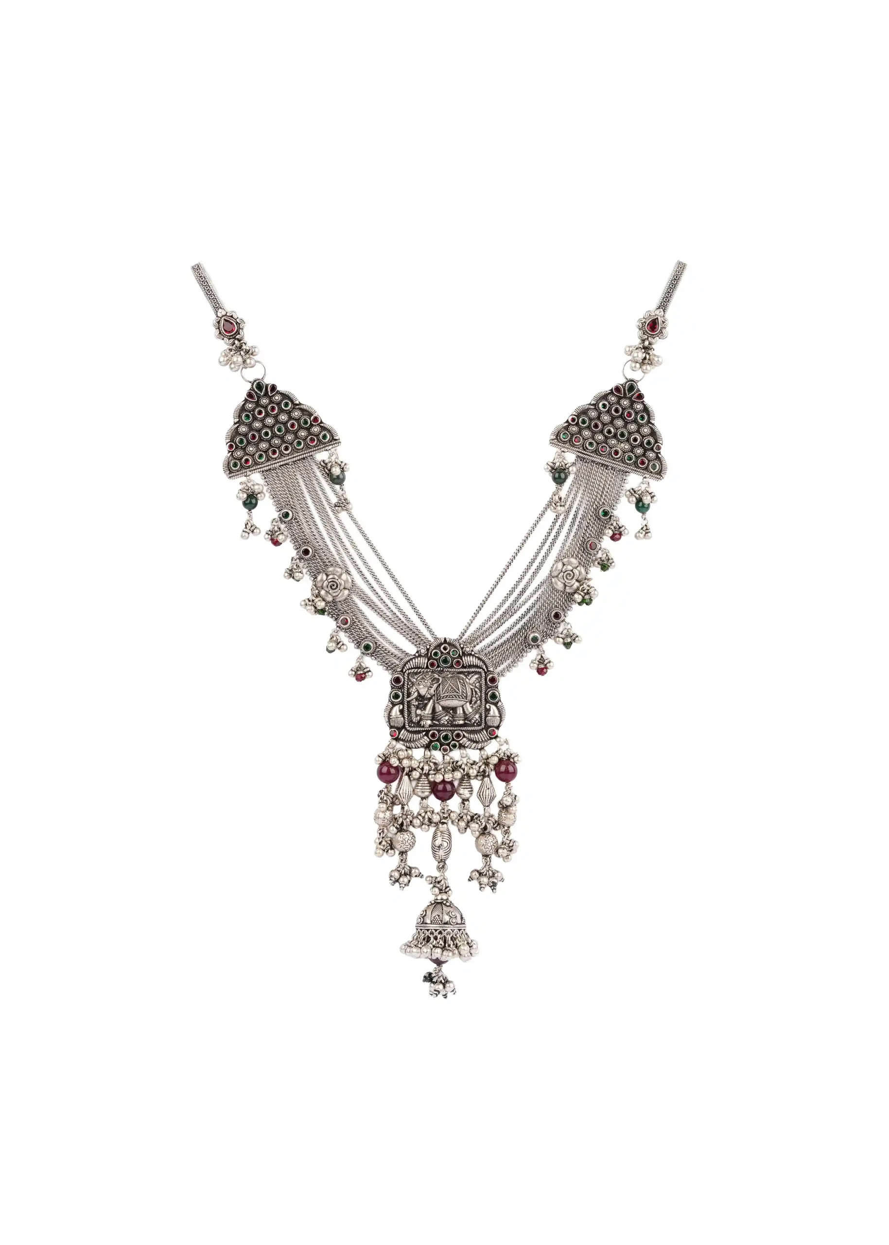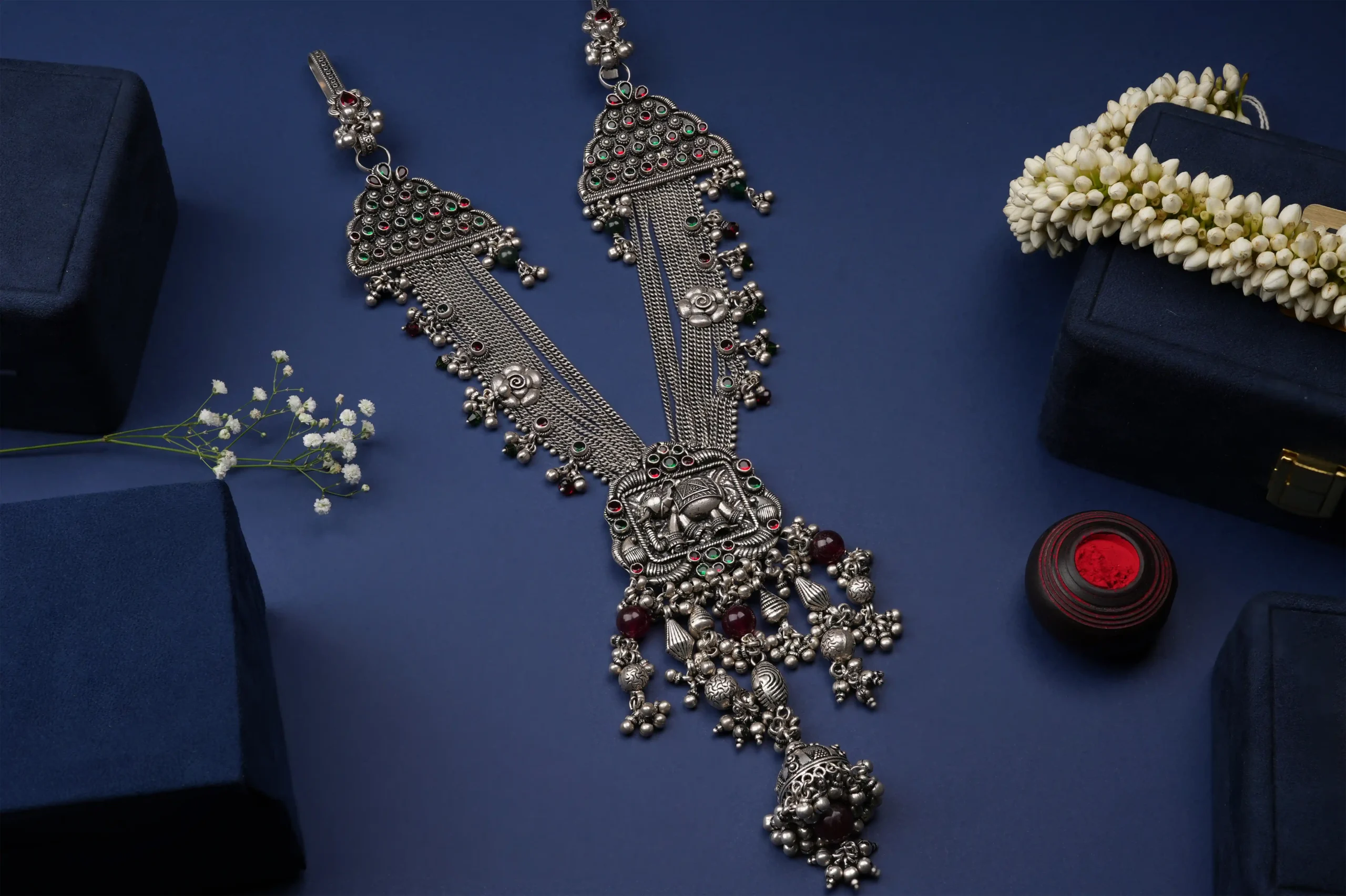 Rooted in royal heritage and temple artistry, the Rajwadi Mandir Judaa is a magnificent traditional ornament that reflects timeless Indian craftsmanship. Designed with layered silver chains and an intricately detailed temple-style centerpiece, this judaa adds grandeur and cultural richness to your ethnic attire.