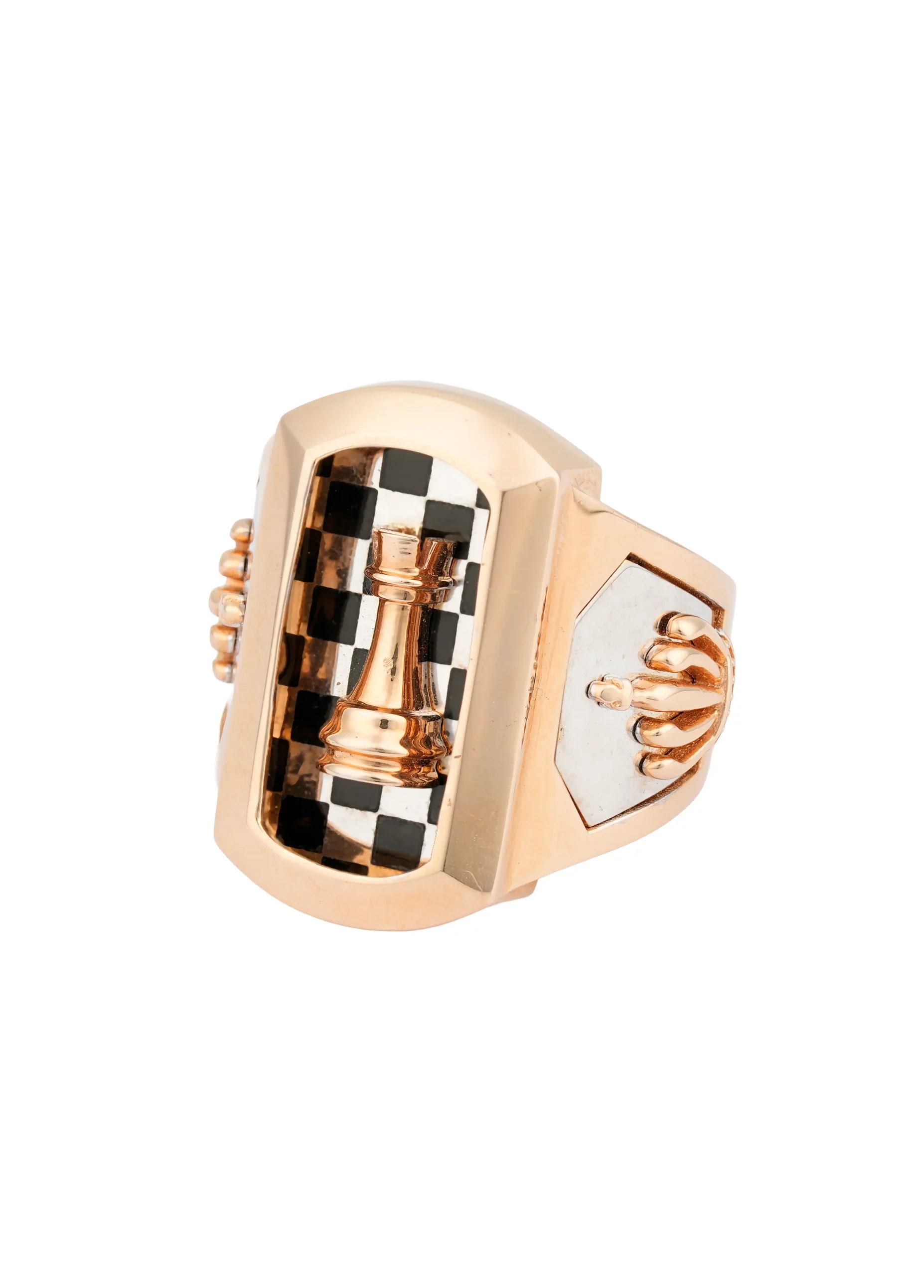 Stand out with confidence and class wearing our Regal Checker Statement Ring. Designed with a bold gold-tone band and a distinctive checkered center panel, this striking ring blends modern style with a royal edge. The contrasting black-and-silver checker pattern adds depth and character, making it a true statement piece for those who appreciate powerful design and elegance.