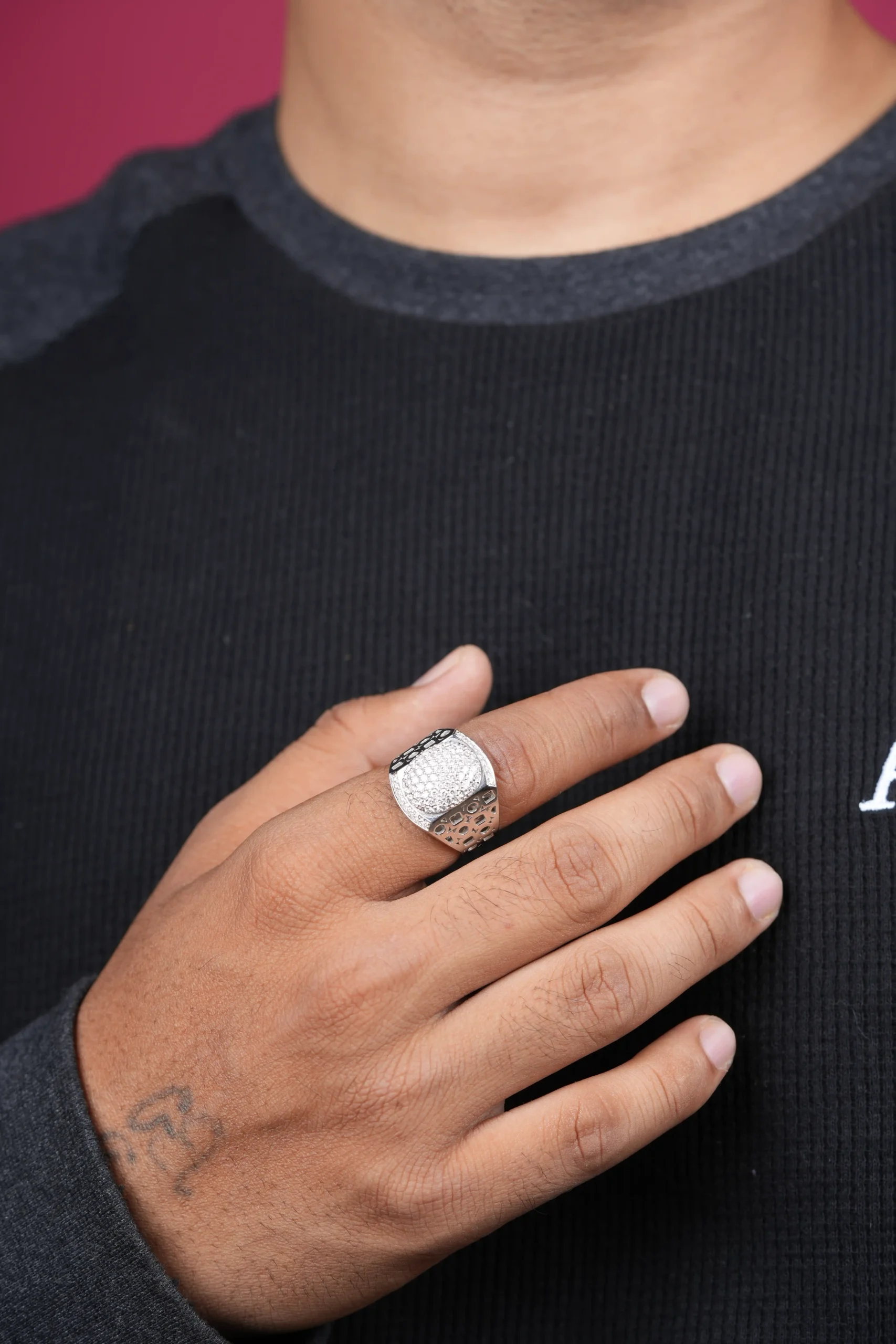 The Regal Matrix Diamond Ring is a bold expression of modern luxury and refined strength. Featuring a classic square top set with precision-cut diamond-look stones in a structured matrix pattern, this ring delivers a powerful, commanding presence. The solid band and detailed sides enhance its durability and masculine appeal.