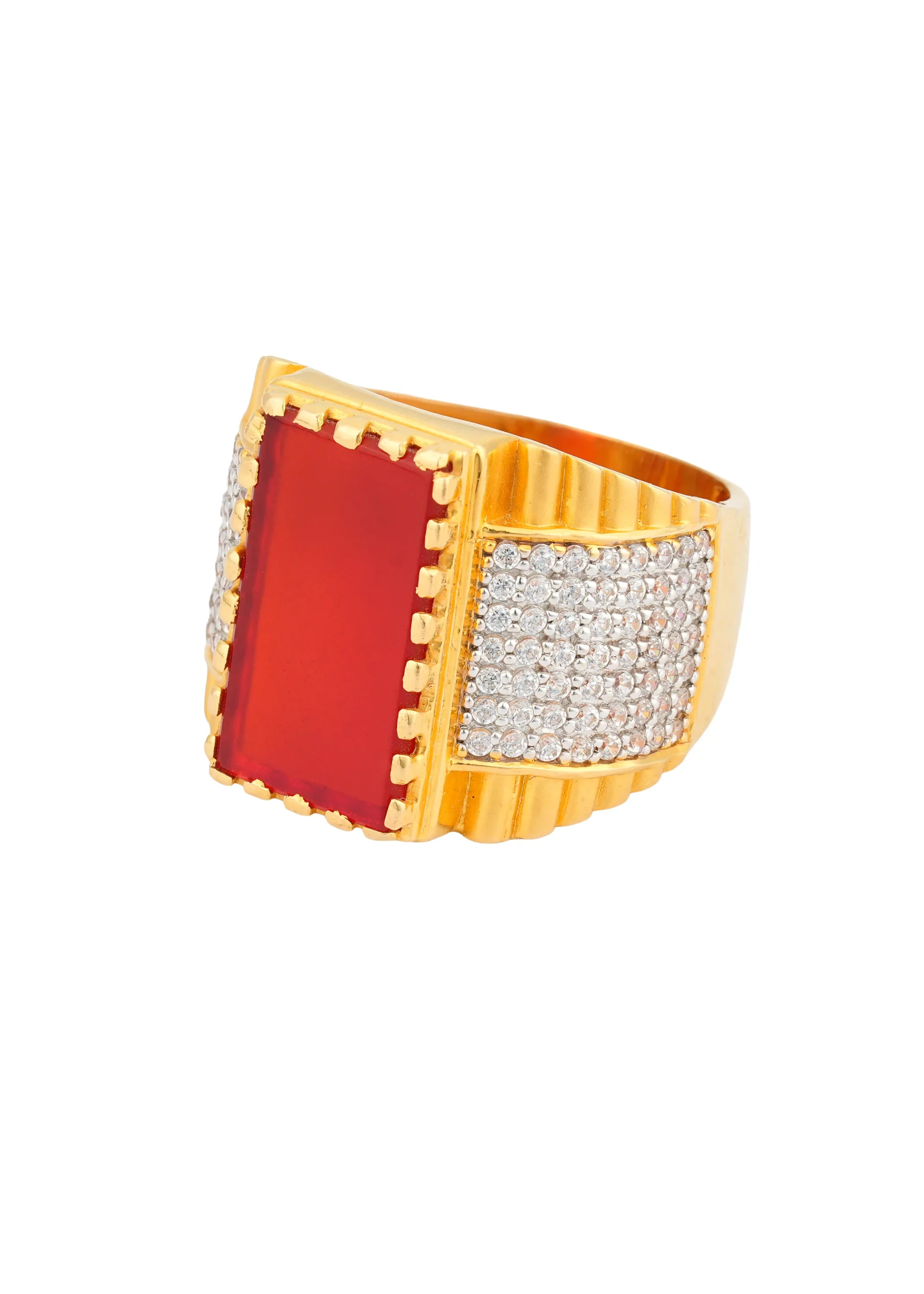 Command elegance and strength with our Regal Ruby Majesty Ring. This striking statement piece features a bold rectangular red stone at its center, beautifully framed in a radiant gold-tone setting. The shimmering stone-studded detailing along the band enhances its royal charm, giving the ring a luxurious and powerful presence that instantly stands out.