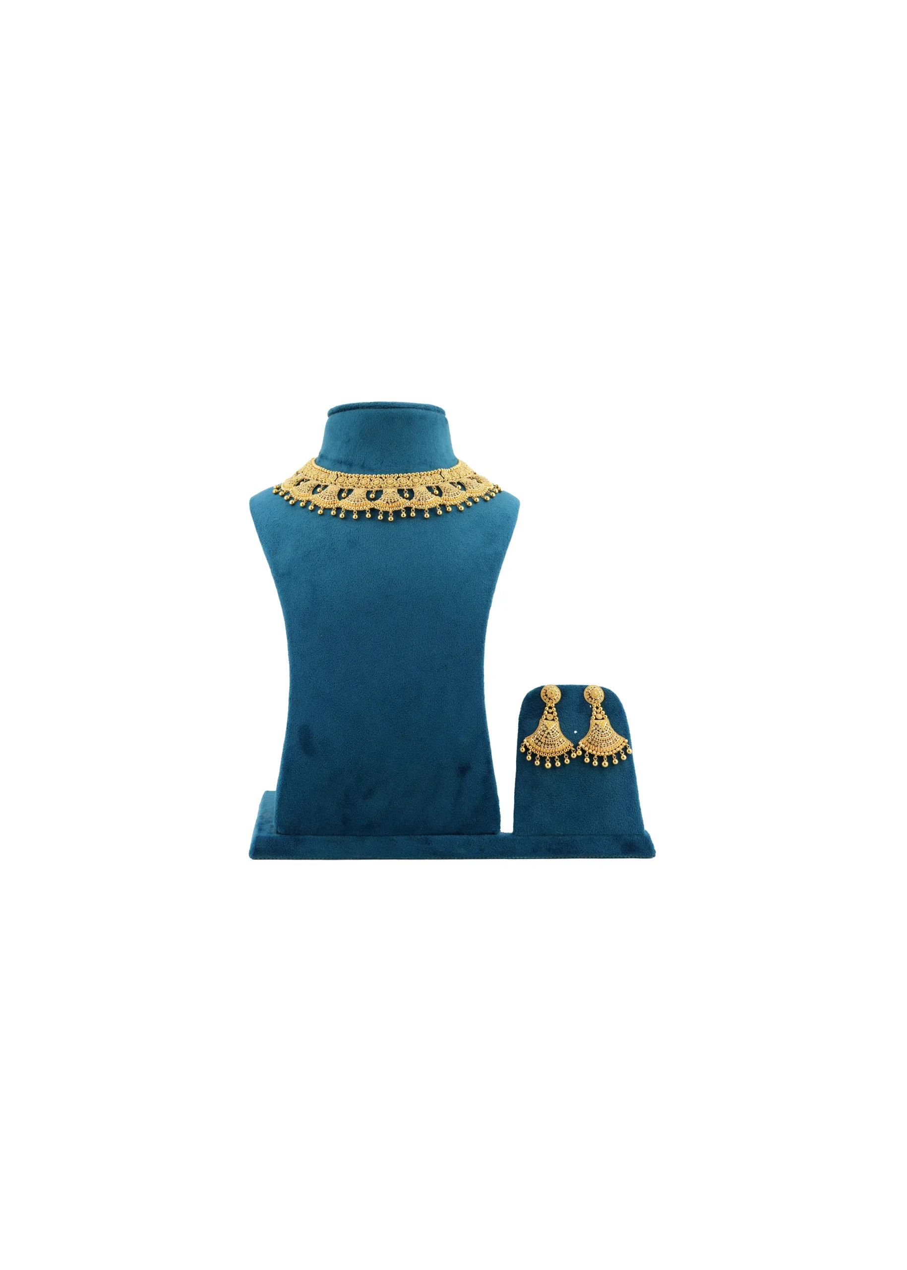 The Royal Temple Set features a beautifully crafted gold-tone choker necklace with intricate temple-inspired detailing and elegant drop danglers. Paired with matching earrings, this set brings a regal, heritage charm to any festive or bridal look.