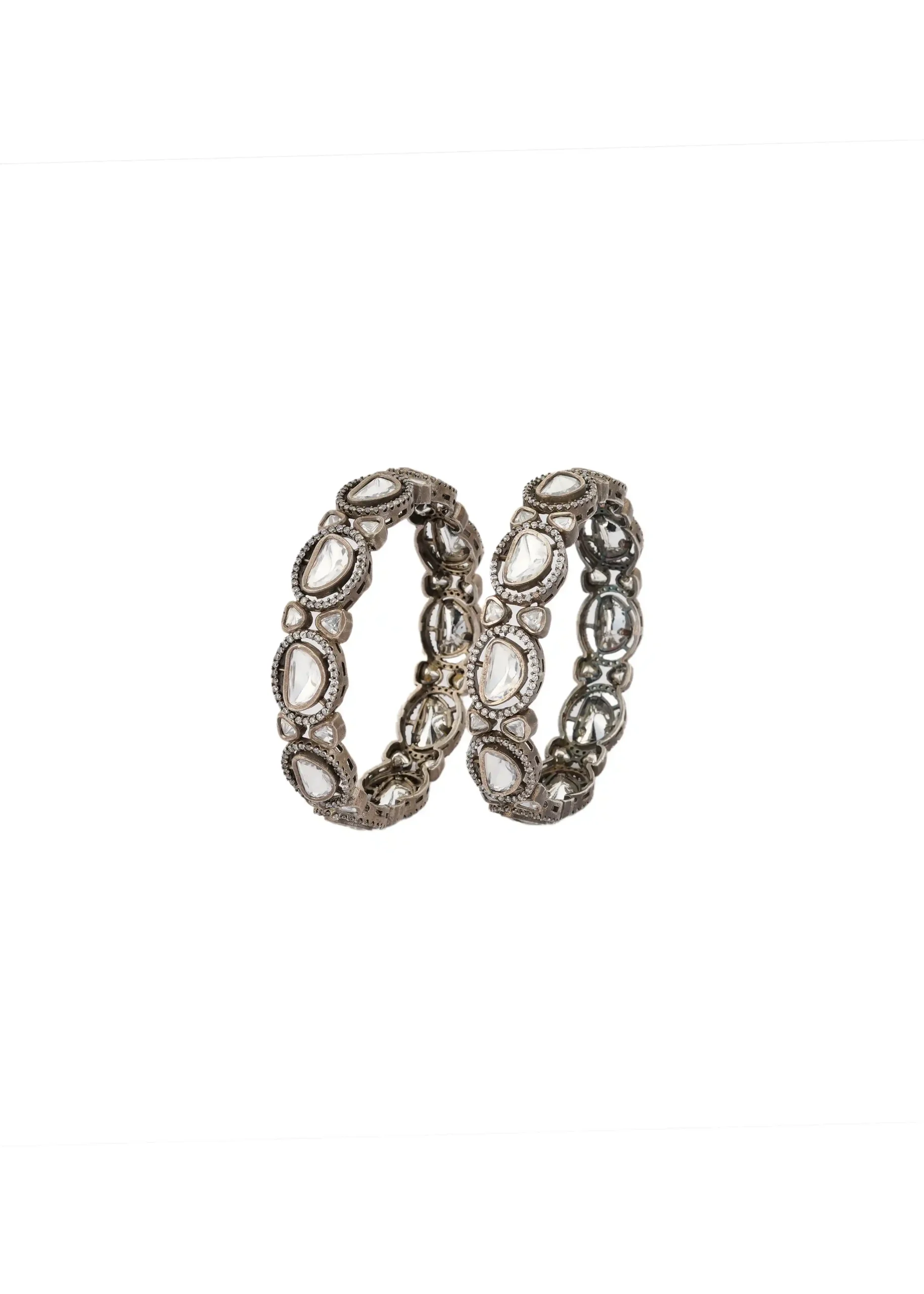Elevate your ethnic jewelry collection with the timeless elegance of the Royal White Kundan Oxidized Silver Bangle. Crafted with exquisite attention to detail, this bangle features beautifully set white kundan stones arranged in a classic linked pattern, enhanced by a rich oxidized silver finish that adds vintage charm and royal appeal.